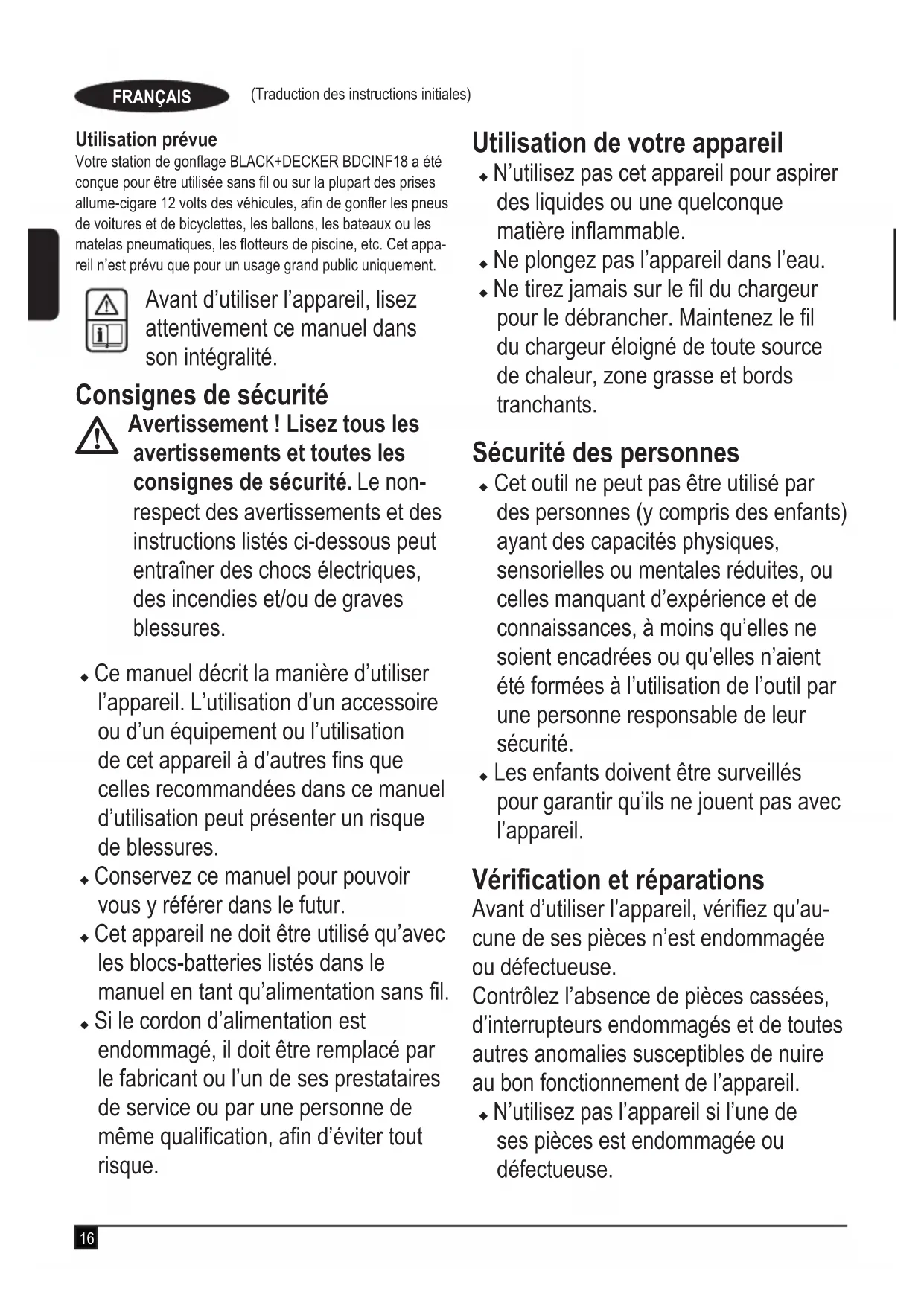 Votre station de gonflage BLACK+DECKER BDCINF18 a été conçue pour être utilisée sans fil ou sur la plupart des prises allume-cigare 12 volts des véhicules, afin de gonfler les pneus de voitures et de bicyclettes, les ballons, les bateaux ou les matelas pneumatiques, les flotteurs de piscine, etc. Cet appareil n'est prévu que pour un usage grand public uniquement.