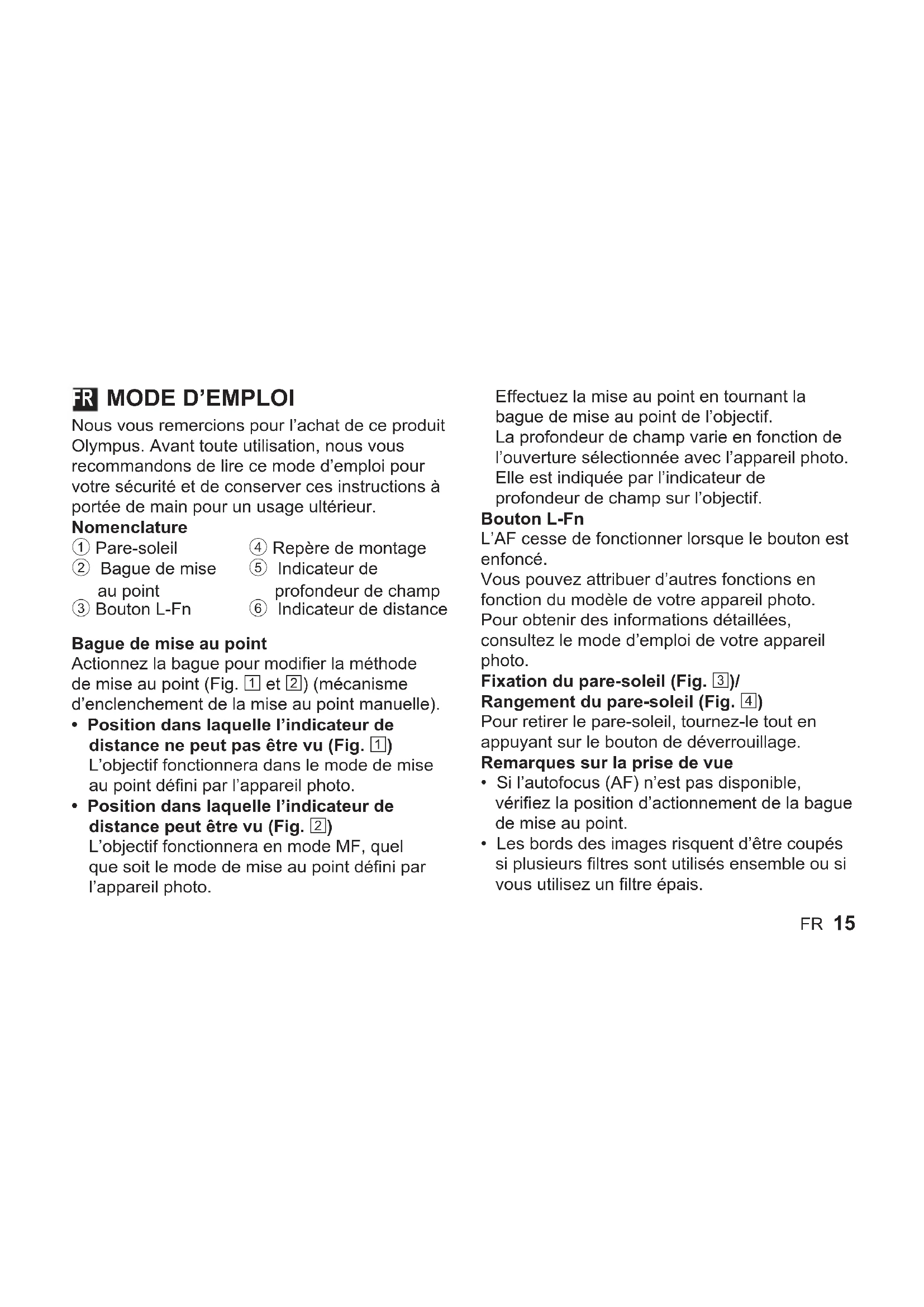 Nous vous remercions pour l’achat de ce produit Olympus. Avant toute utilisation, nous vous recommandons de lire ce mode d’emploi pour votre sécurité et de conserver ces instructions à portée de main pour un usage ultérieur. Nomenclature 1 Pare-soleil 2 Bague de mise au point 3 Bouton L-Fn 4 Repère de montage 5 Indicateur de profondeur de champ 6 Indicateur de distance Bague de mise au point Actionnez la bague pour modifier la méthode de mise au point (Fig. 1 et 2) (mécanisme d’enclenchement de la mise au point manuelle).
