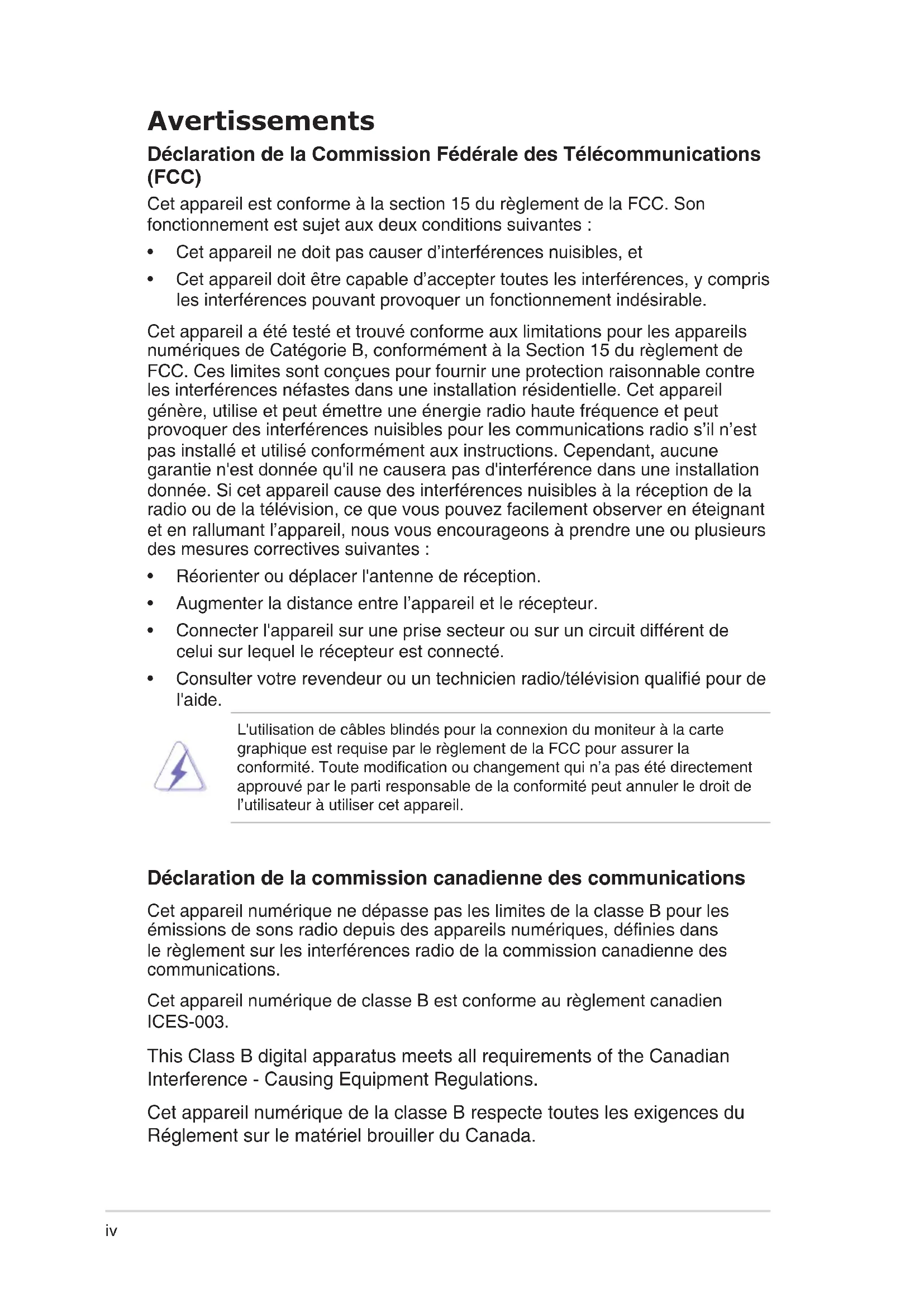 - Consulter votre revendeur ou un technicien radio/télévision qualifié pour de l'aide. L'utilisation de câbles blindés pour la connexion du moniteur à la carte graphique est requise par le règlement de la FCC pour assurer la conformité. Toute modification ou changement qui n’a pas été directement approuvé par le parti responsable de la conformité peut annuler le droit de l’utilisateur à utiliser cet appareil. Déclaration de la commission canadienne des communications Cet appareil numérique ne dépasse pas les limites de la classe B pour les émissions de sons radio depuis des appareils numériques, définies dans le règlement sur les interférences radio de la commission canadienne des communications. Cet appareil numérique de classe B est conforme au règlement canadien ICES-003. This Class B digital apparatus meets all requirements of the Canadian Interference - Causing Equipment Regulations. Cet appareil numérique de la classe B respecte toutes les exigences du Réglement sur le matériel brouiller du Canada.v Informations de sécurité