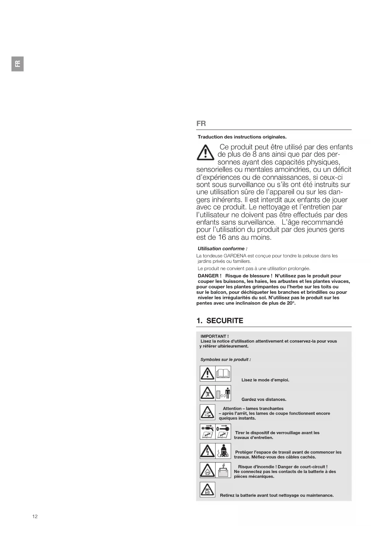 Traduction des instructions originales. Ce produit peut être utilisé par des enfants de plus de 8 ans ainsi que par des per- sonnes ayant des capacités physiques, sensorielles ou mentales amoindries, ou un déficit d’expériences ou de connaissances, si ceux-ci sont sous surveillance ou s’ils ont été instruits sur une utilisation sûre de l’appareil ou sur les dan- gers inhérents. Il est interdit aux enfants de jouer avec ce produit. Le nettoyage et l’entretien par l’utilisateur ne doivent pas être effectués par des enfants sans surveillance. L’âge recommandé pour l’utilisation du produit par des jeunes gens est de 16 ans au moins. Utilisation conforme: La tondeuse GARDENA est conçue pour tondre la pelouse dans les jardins privés ou familiers. Le produit ne convient pas à une utilisation prolongée. DANGER! Risque de blessure! N’utilisez pas le produit pour couper les buissons, les haies, les arbustes et les plantes vivaces, pour couper les plantes grimpantes ou l’herbe sur les toits ou sur le balcon, pour déchiqueter les branches et brindilles ou pour niveler les irrégularités du sol. N’utilisez pas le produit sur les pentes avec une inclinaison de plus de 20°. IMPORTANT ! Lisez la notice d’utilisation attentivement et conservez-la pour vous yréférer ultérieurement. Symboles sur le produit: Lisez le mode d’emploi. Gardez vos distances. Attention – lames tranchantes – après l’arrêt, les lames de coupe fonctionnent encore quelques instants. Tirer le dispositif de verrouillage avant les travaux d’entretien. Protéger l’espace de travail avant de commencer les travaux. Méfiez-vous des câbles cachés. Risque d’incendie ! Danger de court-circuit ! Ne connectez pas les contacts de la batterie à des pièces mécaniques. Retirez la batterie avant tout nettoyage ou maintenance.