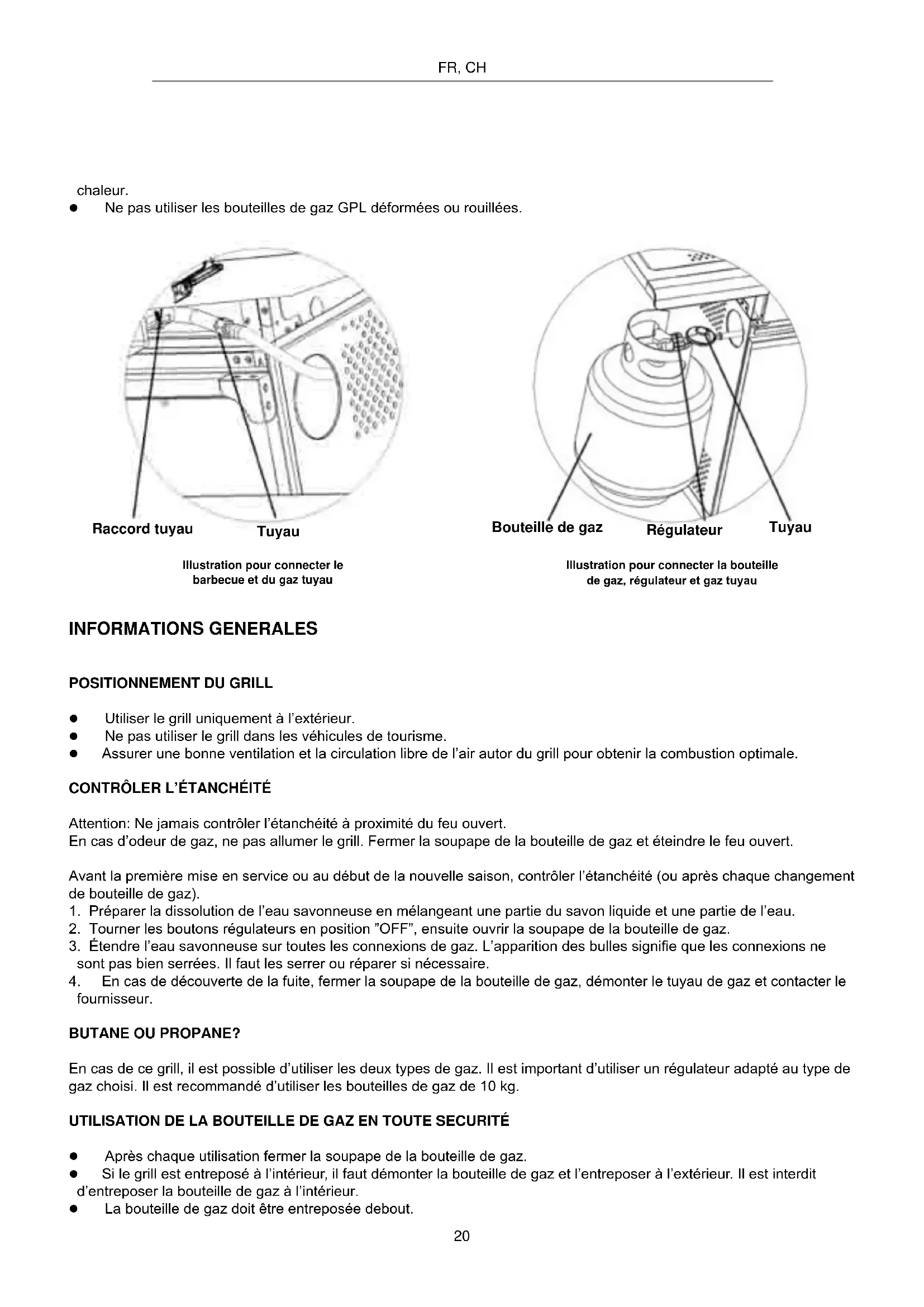 En cas de ce grill, il est possible d'utiliser les deux types de gaz. Il est important d'utiliser un régulateur adapté au type de gaz choisi. Il est recommandé d'utiliser les bouteilles de gaz de 10 kg.