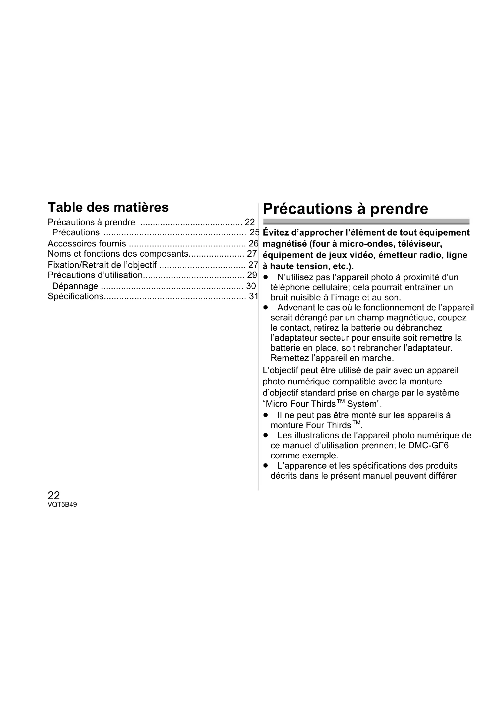 - Spécifications Précautions à prendre Évitez d’approcher l’élément de tout équipement magnétisé (four à micro-ondes, téléviseur, équipement de jeux vidéo, émetteur radio, ligne à haute tension, etc.). ≥ N’utilisez pas l’appareil photo à proximité d’un téléphone cellulaire; cela pourrait entraîner un bruit nuisible à l’image et au son. ≥ Advenant le cas où le fonctionnement de l’appareil serait dérangé par un champ magnétique, coupez le contact, retirez la batterie ou débranchez l’adaptateur secteur pour ensuite soit remettre la batterie en place, soit rebrancher l’adaptateur. Remettez l’appareil en marche. L’objectif peut être utilisé de pair avec un appareil photo numérique compatible avec la monture d’objectif standard prise en charge par le système “Micro Four Thirds p. 31
