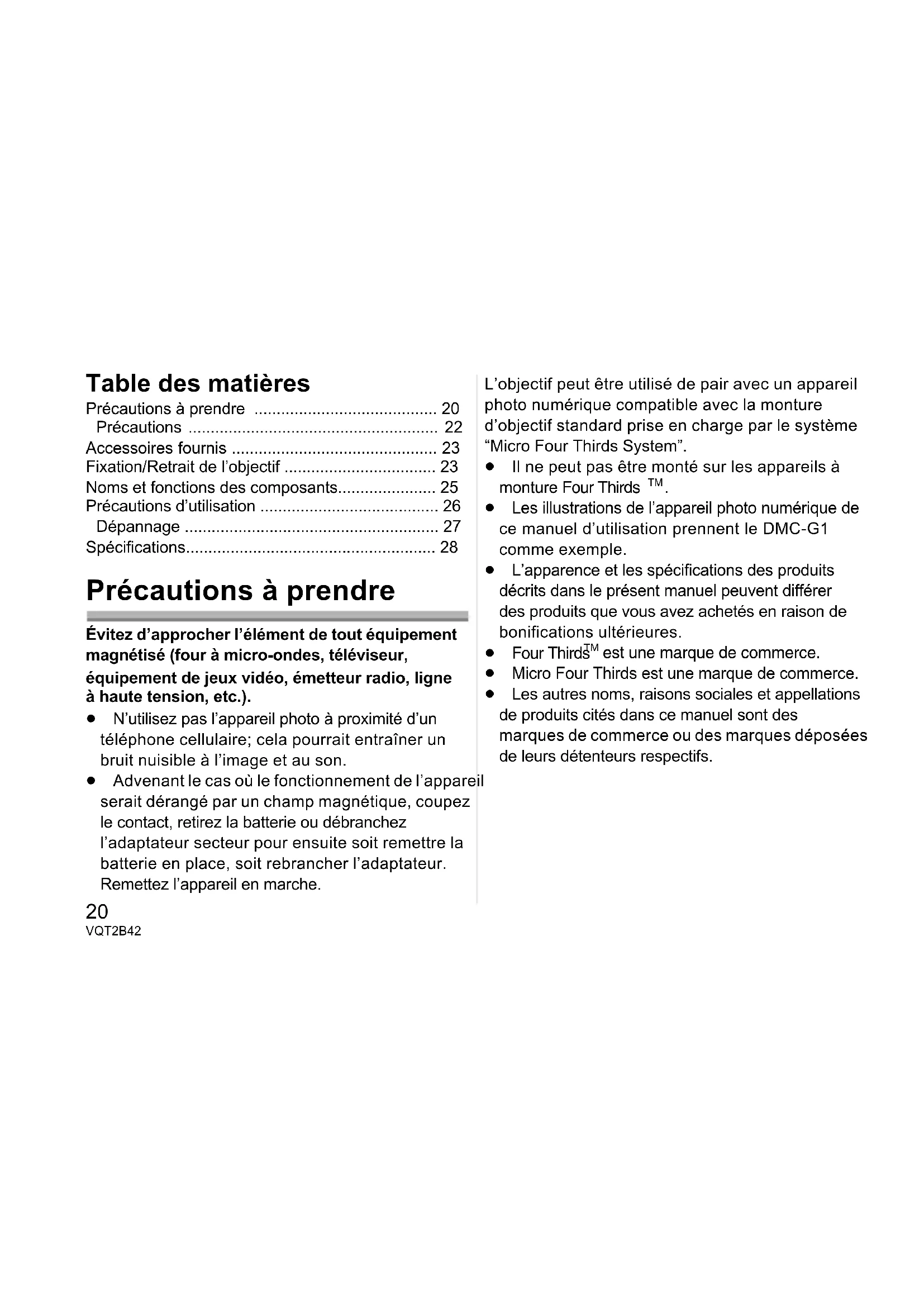 - Spécifications Précautions à prendre Évitez d’approcher l’élément de tout équipement magnétisé (four à micro-ondes, téléviseur, équipement de jeux vidéo, émetteur radio, ligne à haute tension, etc.). ≥ N’utilisez pas l’appareil photo à proximité d’un téléphone cellulaire; cela pourrait entraîner un bruit nuisible à l’image et au son. ≥ Advenant le cas où le fonctionnement de l’appareil serait dérangé par un champ magnétique, coupez le contact, retirez la batterie ou débranchez l’adaptateur secteur pour ensuite soit remettre la batterie en place, soit rebrancher l’adaptateur. Remettez l’appareil en marche. L’objectif peut être utilisé de pair avec un appareil photo numérique compatible avec la monture d’objectif standard prise en charge par le système “Micro Four Thirds System”. ≥ Il ne peut pas être monté sur les appareils à monture Four Thirds p. 28