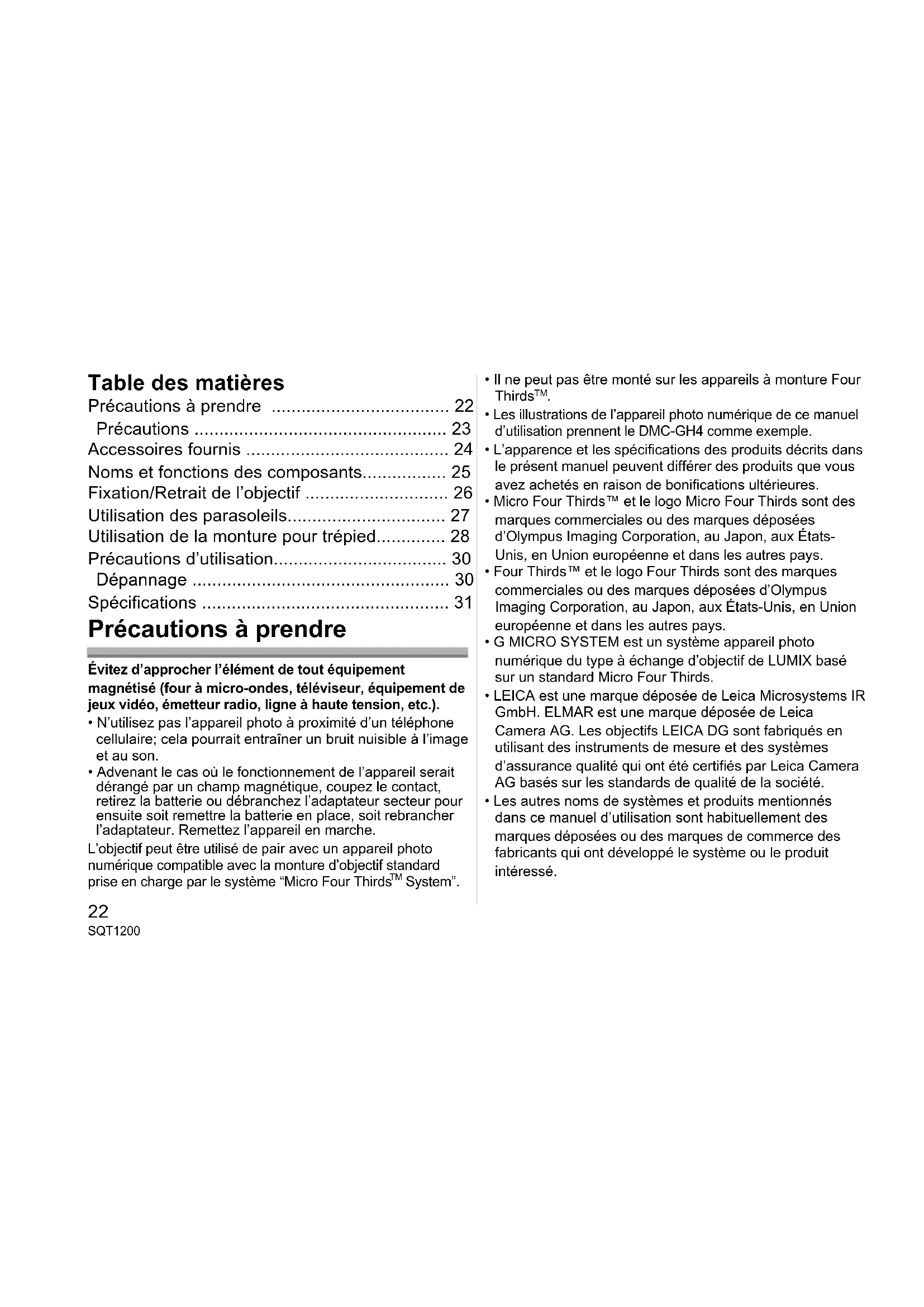 - Advenant le cas où le fonctionnement de l’appareil serait dérangé par un champ magnétique, coupez le contact, retirez la batterie ou débranchez l’adaptateur secteur pour ensuite soit remettre la batterie en place, soit rebrancher l’adaptateur. Remettez l’appareil en marche. L’objectif peut être utilisé de pair avec un appareil photo numérique compatible avec la monture d’objectif standard prise en charge par le système “Micro Four Thirds