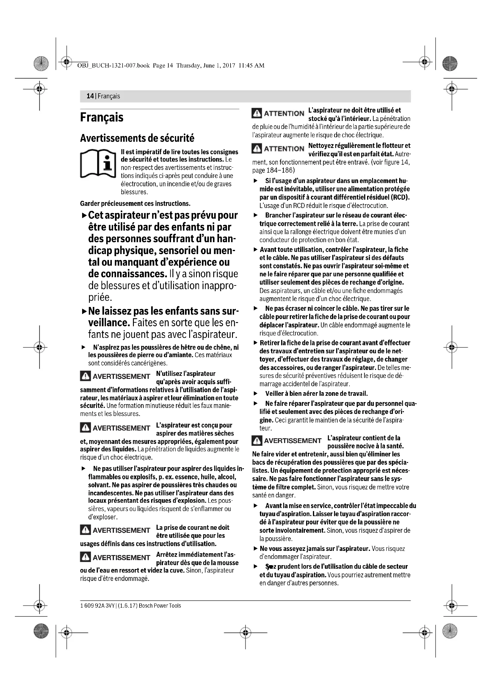 Changing the folded filter 13 182 – 183 Cleaning the float 14 184 – 186 Selecting Accessories – 187 Action Figure Please observe Page WARNING OBJ_BUCH-1321-007.book Page 12 Thursday, June 1, 2017 11:45 AMEnglish | 13 Bosch Power Tools 1 609 92A 3VY | (1.6.17) cannot be cleaned to satisfactory must be disposed of. Such components must be disposed of in impermeable plastic bags conforming with the valid regulations for the disposal of such waste. For maintenance on behalf of the user, the vacuum cleaner must be disassembled, cleaned and maintained as far as fea- sible, without causing a risk for the maintenance personnel or other persons. Prior to disassembly, the vacuum cleaner should be cleaned in order to prevent any risks. The room/en- closure in which the vacuum cleaner is disassembled should be well ventilated. Wear personal protective equipment dur- ing maintenance. After the maintenance, the maintenance ar- ea should be cleaned. If the replacement of the supply cord is necessary, this has to be done by Bosch or an authorized Bosch service agent in or- der to avoid a safety hazard. After-sales Service and Application Service Our after-sales service responds to your questions concern- ing maintenance and repair of your product as well as spare parts. Exploded views and information on spare parts can al- so be found under: www.bosch-pt.com Bosch’s application service team will gladly answer questions concerning our products and their accessories. In all correspondence and spare parts orders, please always include the 10-digit article number given on the nameplate of the product. Great Britain Robert Bosch Ltd. (B.S.C.) P.O. Box 98 Broadwater Park North Orbital Road Denham Uxbridge UB 9 5HJ At www.bosch-pt.co.uk you can order spare parts or arrange the collection of a product in need of servicing or repair. Tel. Service: (0344) 7360109 E-Mail: boschservicecentre@bosch.com Ireland Origo Ltd. Unit 23 Magna Drive Magna Business Park City West Dublin 24 Tel. Service: (01) 4666700 Fax: (01) 4666888 Australia, New Zealand and Pacific Islands Robert Bosch Australia Pty. Ltd. Power Tools Locked Bag 66 Clayton South VIC 3169 Customer Contact Center Inside Australia: Phone: (01300) 307044 Fax: (01300) 307045 Inside New Zealand: Phone: (0800) 543353 Fax: (0800) 428570 Outside AU and NZ: Phone: +61 3 95415555 www.bosch-pt.com.au www.bosch-pt.co.nz Republic of South Africa Customer service Hotline: (011) 6519600 Gauteng – BSC Service Centre 35 Roper Street, New Centre Johannesburg Tel.: (011) 4939375 Fax: (011) 4930126 E-Mail: bsctools@icon.co.za KZN – BSC Service Centre Unit E, Almar Centre 143 Crompton Street Pinetown Tel.: (031) 7012120 Fax: (031) 7012446 E-Mail: bsc.dur@za.bosch.com Western Cape – BSC Service Centre Democracy Way, Prosperity Park Milnerton Tel.: (021) 5512577 Fax: (021) 5513223 E-Mail: bsc@zsd.co.za Bosch Headquarters Midrand, Gauteng Tel.: (011) 6519600 Fax: (011) 6519880 E-Mail: rbsa-hq.pts@za.bosch.com Disposal The vacuum cleaner, accessories and packaging should be sorted for environmental-friendly recycling. Do not dispose of the vacuum cleaner into house- hold waste! Only for EC countries: According to the European Directive 2012/19/EU on Waste Electrical and Electronic Equipment and its implementation into national law, vacuum cleaners that are no longer usable must be collected separately and disposed of in an environ- mentally friendly manner. Subject to change without notice. OBJ_BUCH-1321-007.book Page 13 Thursday, June 1, 2017 11:45 AM14 | Français 1 609 92A 3VY | (1.6.17) Bosch Power Tools Français Avertissements de sécurité Il est impératif de lire toutes les consignes de sécurité et toutes les instructions. Le non-respect des avertissements et instruc- tions indiqués ci-après peut conduire à une électrocution, un incendie et/ou de graves blessures. Garder précieusement ces instructions. Cet aspirateur n’est pas prévu pour être utilisé par des enfants ni par des personnes souffrant d’un han- dicap physique, sensoriel ou men- tal ou manquant d’expérience ou de connaissances. Il y a sinon risque de blessures et d’utilisation inappro- priée. Ne laissez pas les enfants sans sur- veillance. Faites en sorte que les en- fants ne jouent pas avec l’aspirateur. N’aspirez pas les poussières de hêtre ou de chêne, ni les poussières de pierre ou d’amiante. Ces matériaux sont considérés cancérigènes. N’utilisez l’aspirateur qu’après avoir acquis suffi- samment d’informations relatives à l’utilisation de l’aspi- rateur, les matériaux à aspirer et leur élimination en toute sécurité. Une formation minutieuse réduit les faux manie- ments et les blessures. L’aspirateur est conçu pour aspirer des matières sèches et, moyennant des mesures appropriées, également pour aspirer des liquides. La pénétration de liquides augmente le risque d’un choc électrique. Ne pas utiliser l’aspirateur pour aspirer des liquides in- flammables ou explosifs, p. ex. essence, huile, alcool, solvant. Ne pas aspirer de poussières très chaudes ou incandescentes. Ne pas utiliser l’aspirateur dans des locaux présentant des risques d’explosion. Les pous- sières, vapeurs ou liquides risquent de s’enflammer ou d’exploser. La prise de courant ne doit être utilisée que pour les usages définis dans ces instructions d’utilisation. Arrêtez immédiatement l’as- pirateur dès que de la mousse ou de l’eau en ressort et videz la cuve. Sinon, l’aspirateur risque d’être endommagé. L’aspirateur ne doit être utilisé et stocké qu’à l’intérieur. La pénétration de pluie ou de l’humidité à l’intérieur de la partie supérieure de l’aspirateur augmente le risque de choc électrique. Nettoyez régulièrement le flotteur et vérifiez qu’il est en parfait état. Autre- ment, son fonctionnement peut être entravé. (voir figure 14, page 184–186) Si l’usage d’un aspirateur dans un emplacement hu- 