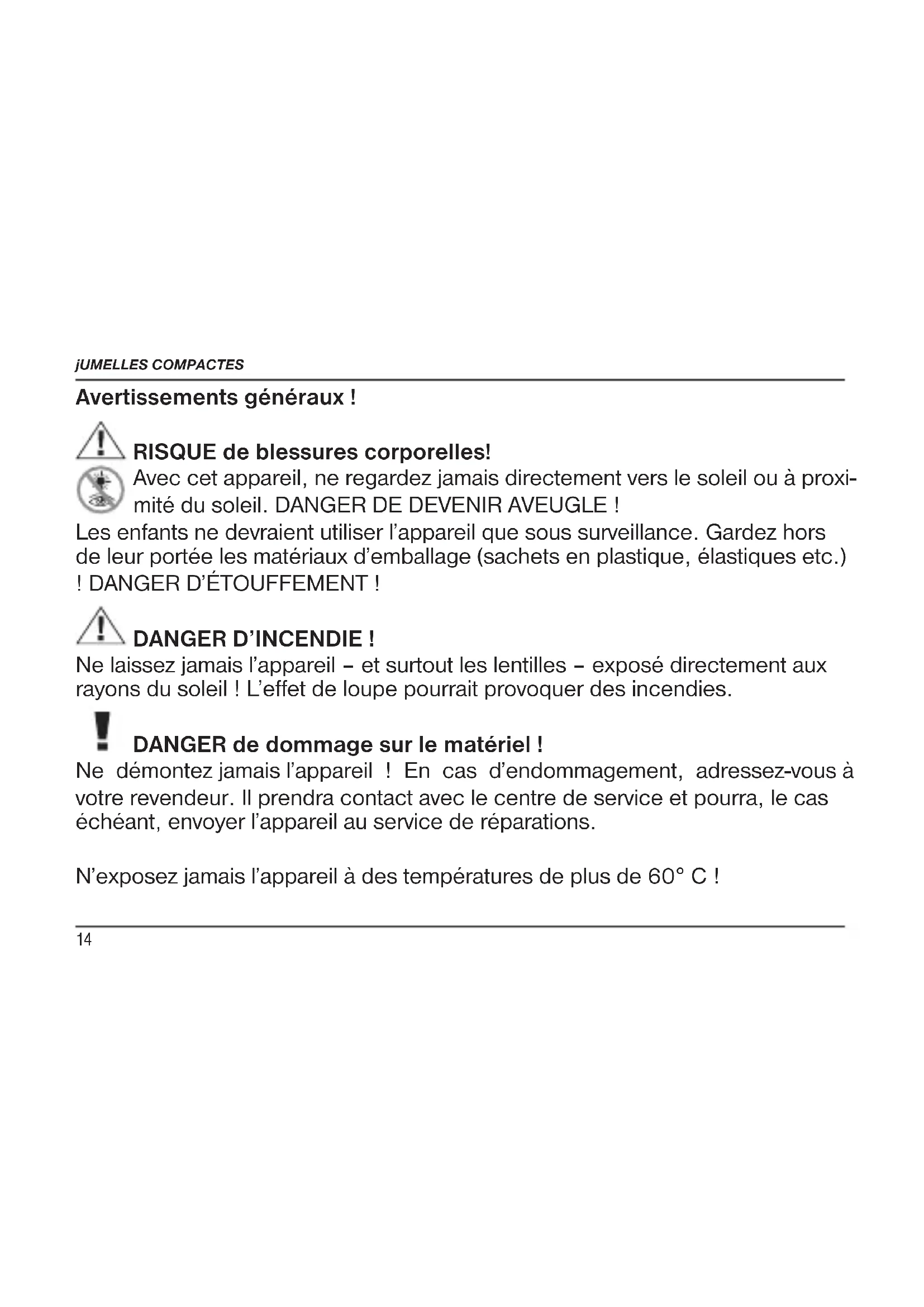 GB12 Rubber Eyecups (2b) To use the binoculars while wearing glasses, turn the rubber eyecups (2b) to- wards the sides and down. If you are not wearing glasses, leave the eyecups in the upright position to achieve the required distance from the pupils. Adjusting the eyepiece distance The distance between the eyes differs between individuals. To achieve perfect interaction between your eyes and the eyepieces of your binoculars set the an- gle at the centre of the binoculars (1) so that you see a circular image (12). Note this setting for later use. Adjusting the focus Look through your binoculars with your right eye closed. Now adjust the image for your left eye using the centre wheel (6) until it is sharp and clear. Close your left eye and adjust the image for your right eye using the dioptre ring (3) until it too is sharp and clear. TIPS on cleaning Lenses (eyepieces and object lenses) should be cleaned with a soft, lint-free cloth (e.g. microfibre) only. Do not use excessive pressure - this may scratch the lens. COMPACT BINOCULARS13 Dampen the cleaning cloth with a spectacle cleaning fluid and use it on very dirty lenses. Protect the device against dirt and dust. Leave it to dry properly after use at room temperature. Then put the dust caps on and store the device in the case provided. GB14 Avertissements généraux ! RISQUE de blessures corporelles! Avec cet appareil, ne regardez jamais directement vers le soleil ou à proxi- mité du soleil. DANGER DE DEVENIR AVEUGLE ! Les enfants ne devraient utiliser l’appareil que sous surveillance. Gardez hors de leur portée les matériaux d’emballage (sachets en plastique, élastiques etc.) ! DANGER D’ÉTOUFFEMENT ! DANGER D’INCENDIE ! Ne laissez jamais l’appareil – et surtout les lentilles – exposé directement aux rayons du soleil ! L’effet de loupe pourrait provoquer des incendies. DANGER de dommage sur le matériel ! Ne démontez jamais l’appareil ! En cas d’endommagement, adressez-vous à votre revendeur. Il prendra contact avec le centre de service et pourra, le cas échéant, envoyer l’appareil au service de réparations. N’exposez jamais l’appareil à des températures de plus de 60° C ! jUMELLES COMPACTES15 Lentilles oculaires pour personnes portant des lunettes Selon le modèle que vous possédez, vos jumelles sont équipées soit d’œille- tons twist-up (2a) soit d’œilletons en caoutchouc (2b). Étant donné que chez les porteurs de lunettes il y a toujours un écart plus grand entre l’oculaire des jumelles et la pupille, ces deux types d’œilleton peuvent être réglés de façon individuelle. Œilletons twist-up (2a) Si vous souhaitez utiliser les jumelles en portant des lunettes, rabattez les œille- tons twist-up (2a). Si vous ne portez pas de lunettes, ressortez les œilletons afin d’obtenir l’écart interpupillaire nécessaire.