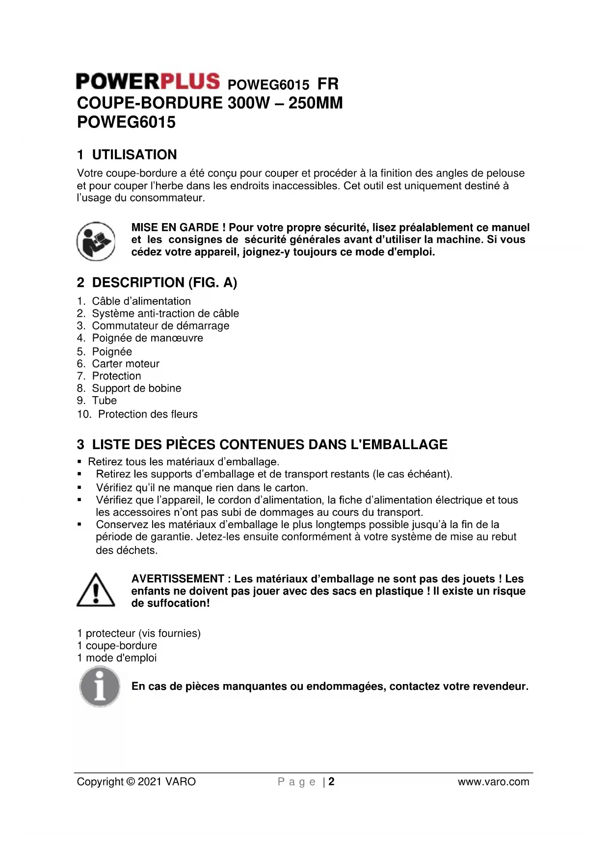 VARO – Vic. Van Rompuy N.V. - Joseph Van Instraat 9 - BE2500 Lier - BELGIQUE, déclare que : Appareil : COUPE BORDURE Marque : PowerPlus Modèle : POWEG6015 est en conformité avec les exigences essentielles et les autres dispositions pertinentes des Directives européennes applicables, basées sur l'application des normes européennes harmonisées. Toute modification non autorisée de l'appareil annule cette déclaration. Directives européennes (y compris, le cas échéant, leurs amendements à la date de la signature) : 2011/65/EU 2006/42/EC 2014/30/EU 2000/14/EC Annex VI LwA Measured 91dB(A) Guaranteed 96dB(A) Notified Body TuV Sud - DE Normes européennes harmonisées (y compris, le cas échéant, leurs amendements à la date de la signature) : EN60335-1 : 2012 EN50636-2-91 : 2014 EN55014-1 : 2017 EN55014-2 : 2015 EN61000-3-2 : 2014 EN61000-3-3 : 2013 Détenteur de la Documentation technique : Philippe Vankerkhove, VARO – Vic. Van Rompuy N.V. Le soussigné agit au nom du PDG de l'entreprise, Philippe Vankerkhove Réglementation – Directeur de la conformité 26/05/2021, Lier-BelgiumPOWEG6015 EN Copyright © 2021 VARO P a g e | 1 www.varo.com 1 APPLICATION .................................................................................. 2