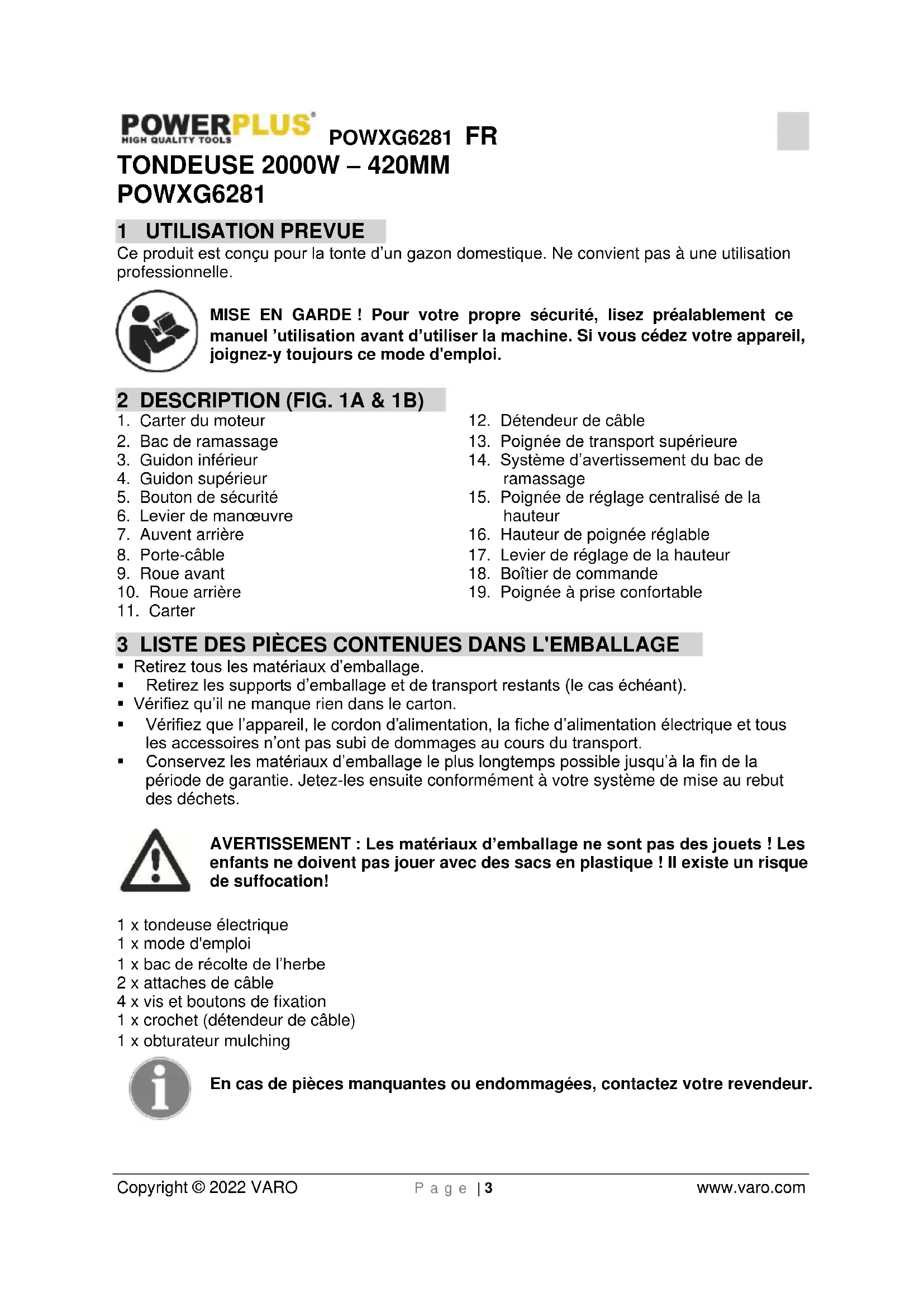 enfants ne doivent pas jouer avec des sacs en plastique ! Il existe un risque de suffocation! 1 x tondeuse électrique 1 x mode d'emploi 1 x bac de récolte de l’herbe 2 x attaches de câble 4 x vis et boutons de fixation 1 x crochet (détendeur de câble) 1 x obturateur mulching En cas de pièces manquantes ou endommagées, contactez votre revendeur.POWXG6281 FR Copyright © 2022 VARO P a g e | 4 www.varo.com 4 PICTOGRAMMES Les symboles suivants sont utilisés dans ce mode d’emploi et/ou sur la machine :
