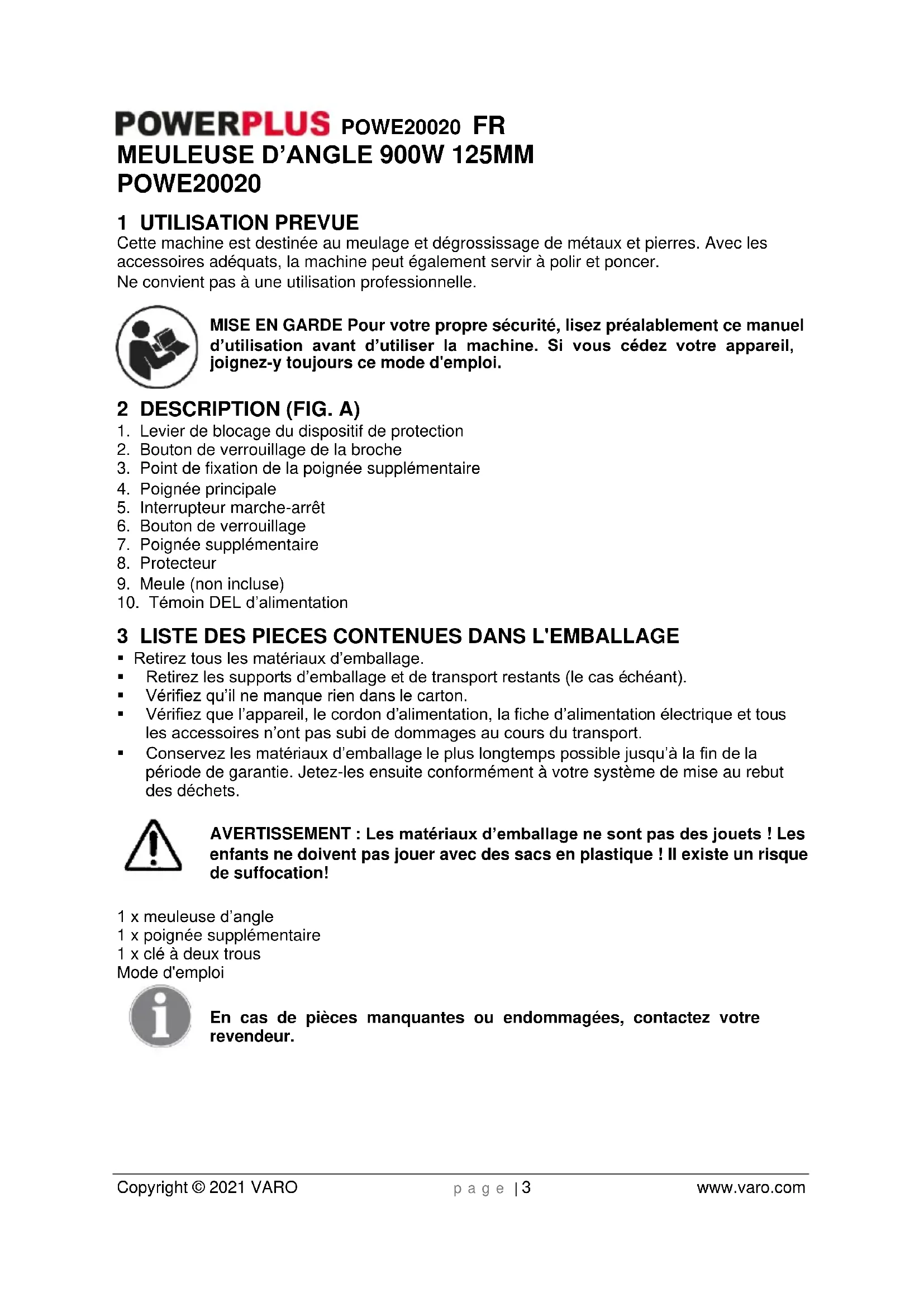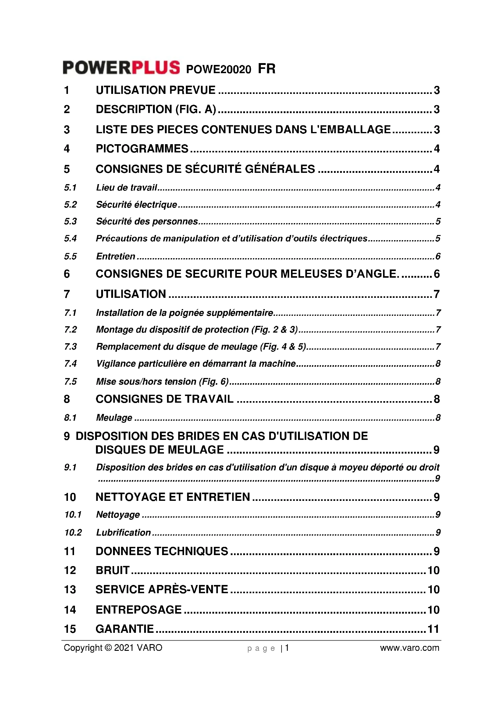 - Entretenez l'appareil avec soin. Contrôlez qu’aucune pièce mobile de l'appareil n’est décentrée ou grippée, qu’aucune pièce n'est cassée ou endommagée au point d'entraver le fonctionnement de l'appareil. Faites réparer les pièces endommagées avant d'utiliser l'appareil. De nombreux accidents sont dus à un entretien défaillant des outils électriques.POWE20020 FR Copyright © 2021 VARO p a g e | 6 www.varo.com