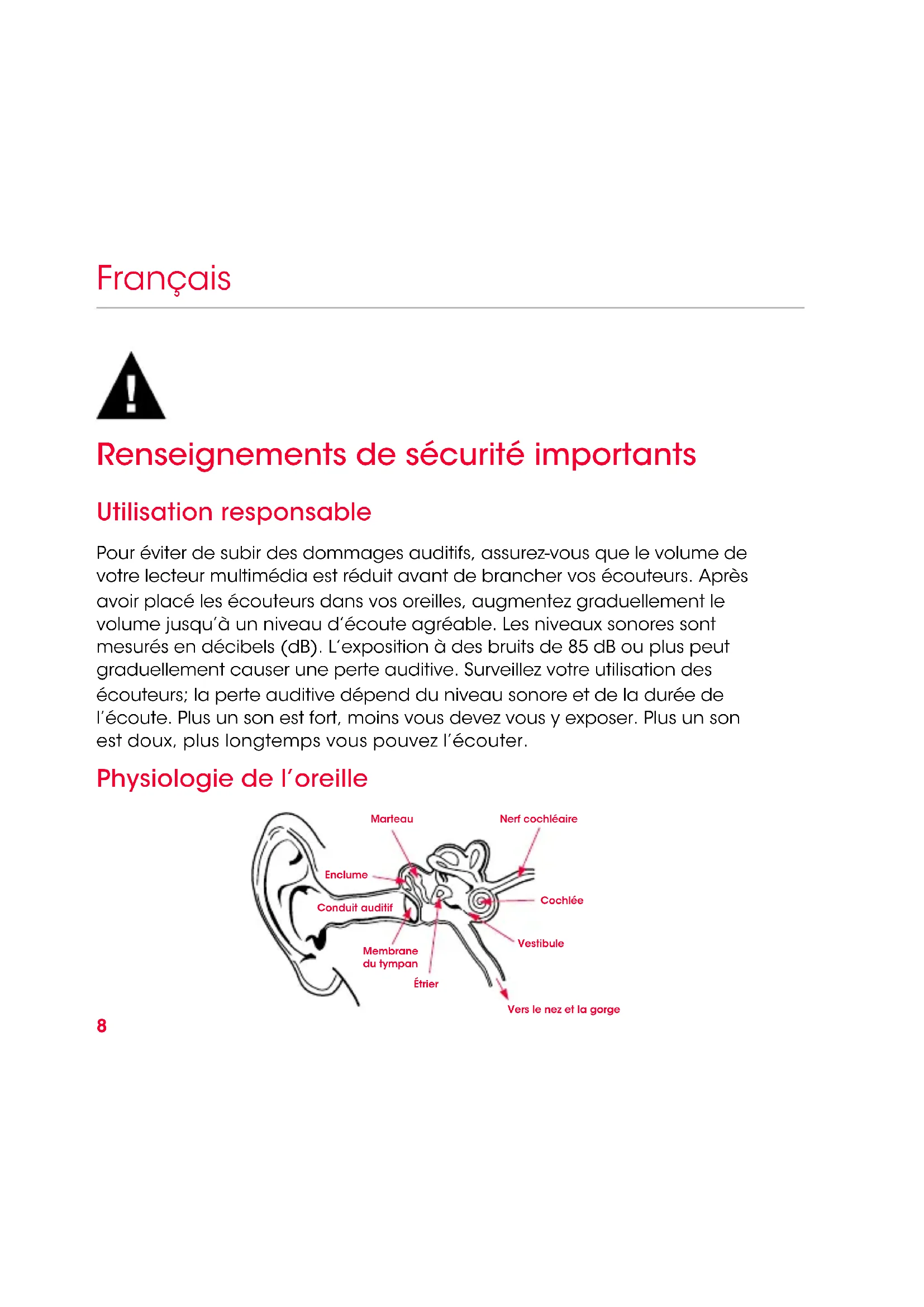 - Contrôle de volume Remarque : Cette fonctionnalité varie selon l’appareil. HTC, Blackberry et AndroidiPod, iPhone et iPad12 Français Pour lire ou interrompre la lecture d'une chanson ou d'une vidéo: Appuyez sur le bouton central de la télécommande, puis relâchez-le. Appuyez à nouveau sur le bouton central de la télécommande pour reprendre la lecture. Pour sauter une chanson ou une vidéo ou revenir à la chanson ou à la vidéo précédente: Appuyez deuxfois sur le bouton central de la télécommande pour sauter à la chanson ou à la vidéo suivante. Appuyez troisfois sur le bouton central de la télécommande pour revenir à la chanson ou à la vidéo précédente. Pour avancer ou reculer rapidement dans une chanson ou une vidéo en cours de lecture: Appuyez rapidement deuxfois sur le bouton central de la télécommande et maintenez le bouton enfoncé la deuxièmefois pour avancer rapidement. Relâchez le bouton pour arrêter le balayage. Appuyez rapidement troisfois sur le bouton central de la télécommande et maintenez le bouton enfoncé la troisièmefois pour reculer rapidement. Pour répondre à un appel ou raccrocher: Appuyez sur le bouton central de la télécommande une fois et relâchez-le pour répondre. Répétez la procédure pour raccrocher. Pour refuser un appel entrant: Appuyez sur le bouton central de la télécommande et maintenez-le enfoncé pendant deuxsecondes, puis relâchez-le. Vous entendrez deuxsignaux sonores pour vous indiquer que l’appel a été refusé. Commande vocale: Appuyez sur le bouton central de la télécommande et maintenez-le enfoncé jusqu’à ce que la fonction de commande vocale s’active. Cette fonctionnalité varie selon l’appareil que vous utilisez. Contrôle de volume: Appuyez sur le bouton du haut de la télécommande pour augmenter le volume. Appuyez sur le bouton du bas de la télécommande pour réduire le volume. Cette fonctionnalité varie selon l’appareil que vous utilisez.13 Français Connectez et proftez de votre écoute Enregistrez vos écouteurs Beats dès aujourd’hui www.bea tsbydre.com/register14 Español Información importante sobre la seguridad Escuche de manera responsable Para evitar el daño a sus oídos, asegúrese de bajar el volumen de su reproductor de música antes de conectar los auriculares. Luego de colocar los auriculares en sus oídos, suba el volumen gradualmente hasta que alcance un nivel de audición adecuado. Los niveles de ruido se miden en decibeles (dB), la exposición a cualquier ruido igual o mayor a los 85 dB puede causar la pérdida gradual de la audición. Controle su uso; la pérdida de la audición es una función de volumen versus tiempo. Mientras más alto sea el volumen, menor es el tiempo que usted puede exponerse a él. Mientras más bajo sea el volumen, mayor es el tiempo que usted puede escuchar su música. Fisiología del oído Martillo Nervio coclear Estribo Membrana timpánica Canal auditivo Cóclea Yunque Vestíbulo Hacia la nariz/garganta15 Español