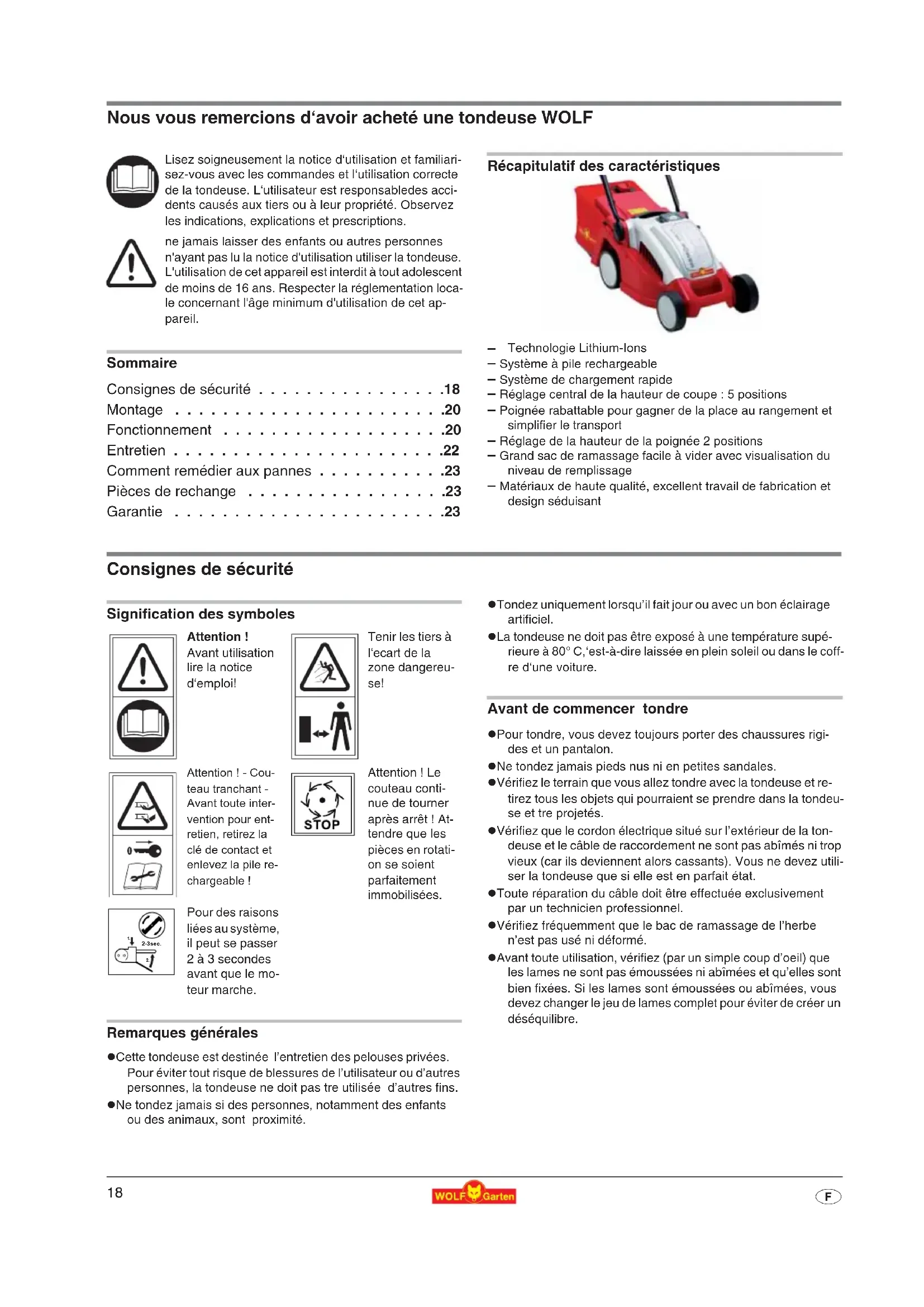 - F Nous vous remercions d‘avoir acheté une tondeuse WOLF Sommaire Consignes de sécurité p. 18