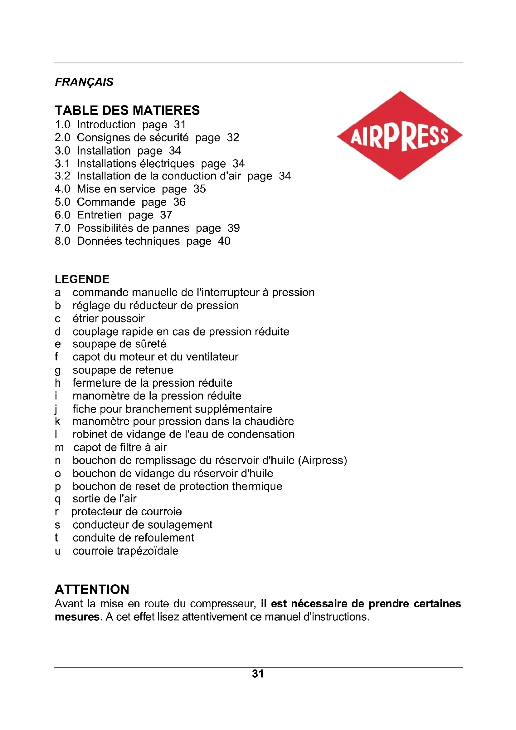 Avec l'achat de votre compresseur AIRPRESS vous êtes devenu propriétaire d'un compresseur extrêmement rentable et fiable. Une utilisation correcte et un entretien régulier vous permettront de profiter de cet appareil pendant de nombreuses années. Vous trouverez dans ce livret les instructions nécessaires à l'usage et à l'entretien de votre compresseur. Lisez-le attentivement et rangez-le à proximité du compresseur afin de le consulter en cas de nécessité. Le compresseur a été réalisé pour fournir de l’air comprimé. L’appareil ne peut pas être utilisé pour produire de l’air destiné à la respiration humaine ou utilisé en contact direct avec des substances alimentaires. Cet appareil devra être destiné uniquement à l’usage pour lequel il a été expressément conçu. Toute autre utilisation doit être considéré comme impropre et donc déraisonnable. Le constructeur ne peut pas être tenu pour responsable des éventuels dommages causés par des utilisations impropres, erronées et déraisonnables. Cet appareil n’est pas adapté pour l’installation à l’extérieur.