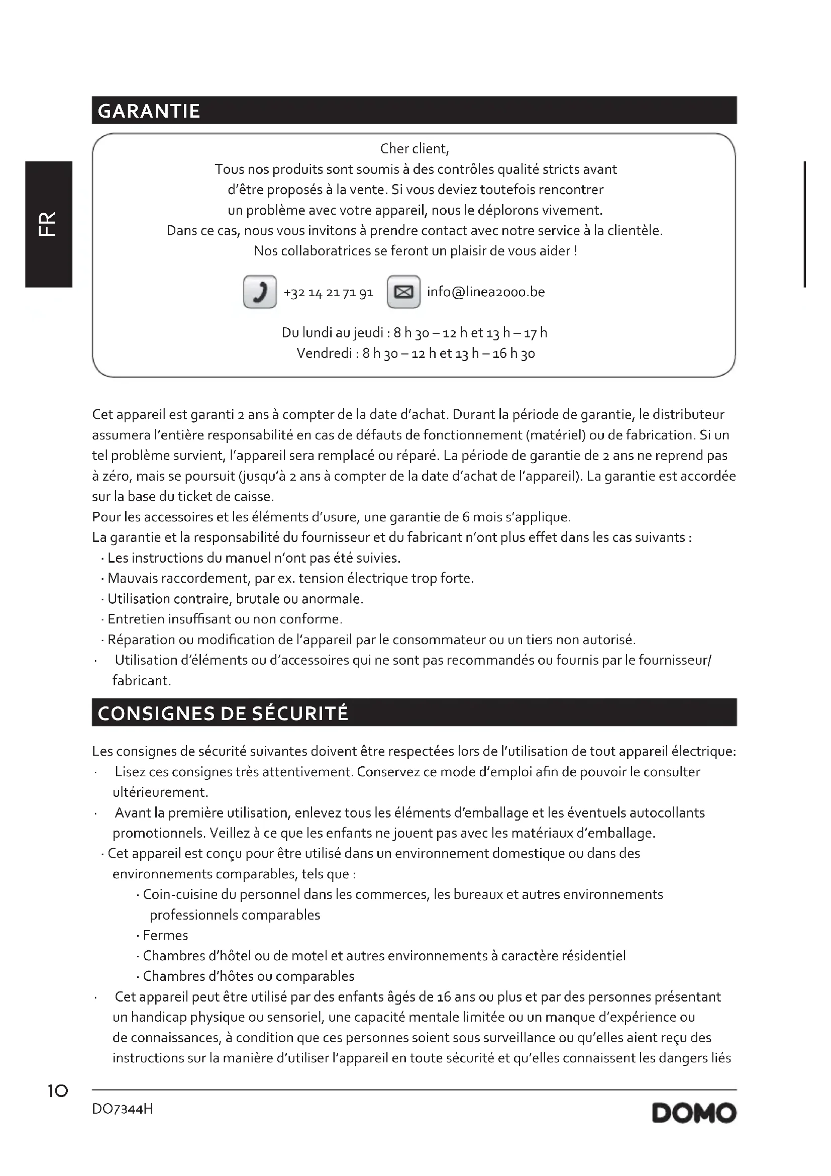 - Cet appareil peut être utilisé par des enfants âgés de 16 ans ou plus et par des personnes présentant un handicap physique ou sensoriel, une capacité mentale limitée ou un manque d’expérience ou de connaissances, à condition que ces personnes soient sous surveillance ou qu’elles aient reçu des instructions sur la manière d’utiliser l’appareil en toute sécurité et qu’elles connaissent les dangers liés11 DO7344Hwww.domo-elektro.be à son utilisation. Les enfants ne peuvent pas jouer avec cet appareil. L’entretien et le nettoyage de l’appareil ne peuvent pas être eectués par des enfants, sauf s’ils sont âgés de plus de 16 ans et sous la surveillance d’un adulte. · Gardez l’appareil et le cordon électrique hors de portée des enfants.