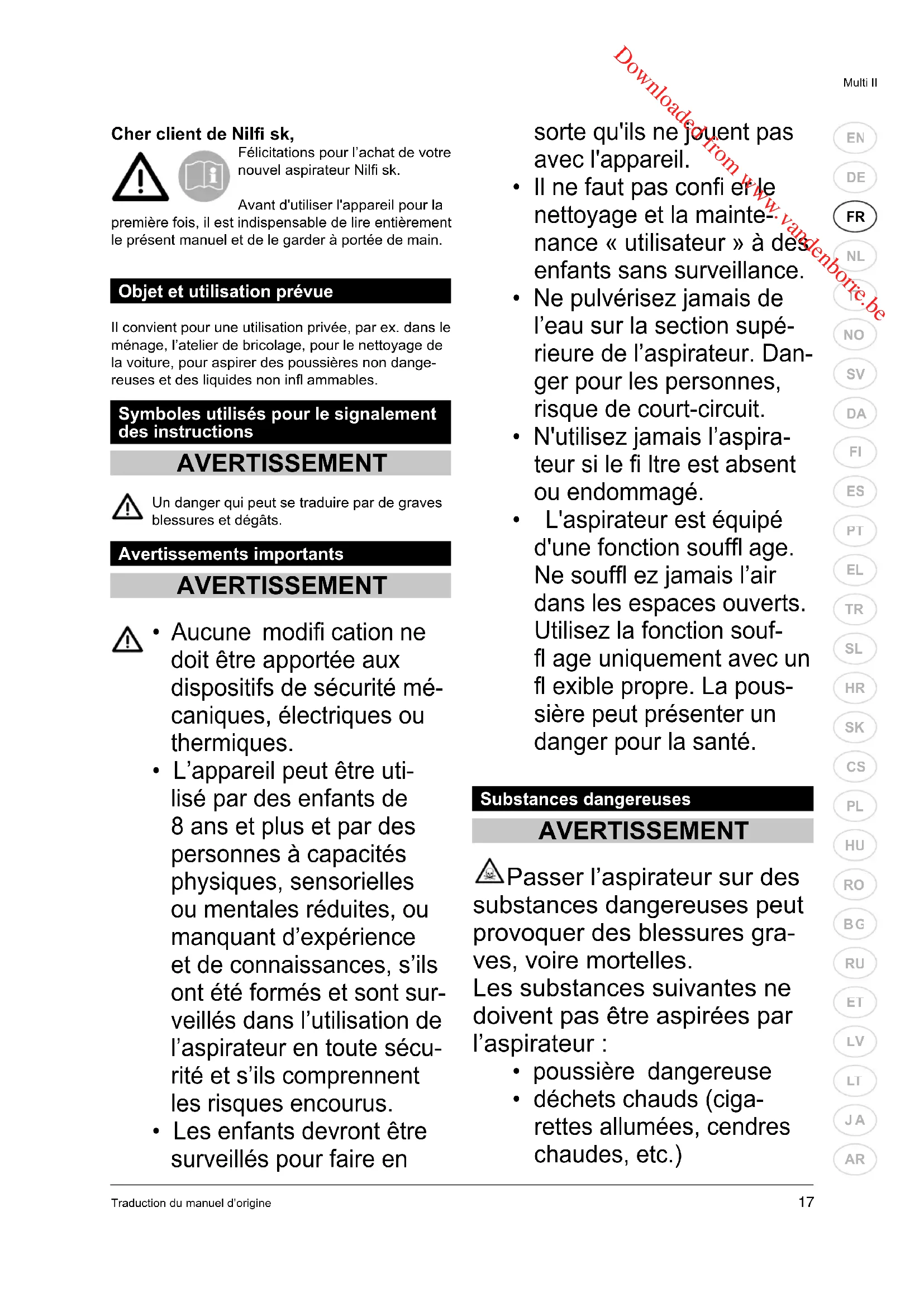 Cher client de Nilfi sk, Félicitations pour l’achat de votre nouvel aspirateur Nilfi sk. Avant d'utiliser l'appareil pour la première fois, il est indispensable de lire entièrement le présent manuel et de le garder à portée de main. Objet et utilisation prévue Il convient pour une utilisation privée, par ex. dans le ménage, l’atelier de bricolage, pour le nettoyage de la voiture, pour aspirer des poussières non dange- reuses et des liquides non infl ammables. Symboles utilisés pour le signalement des instructions AVERTISSEMENT Un danger qui peut se traduire par de graves blessures et dégâts. Avertissements importants AVERTISSEMENT