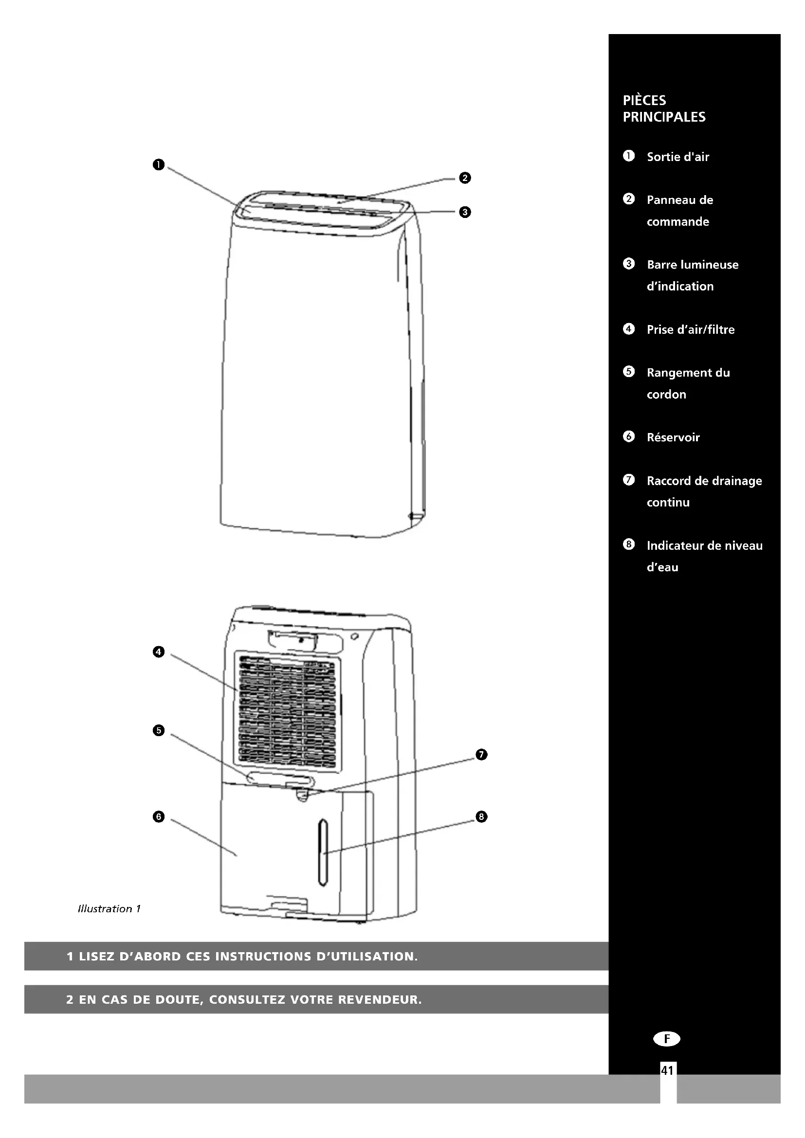 401 LISEZ D’ABORD CES INSTRUCTIONS D’UTILISATION. 2 EN CAS DE DOUTE, CONSULTEZ VOTRE REVENDEUR. Sortie d'air Panneau de commande Barre lumineuse d’indication Prise d’air/filtre Rangement du cordon Réservoir Raccord de drainage continu Indicateur de niveau d’eau