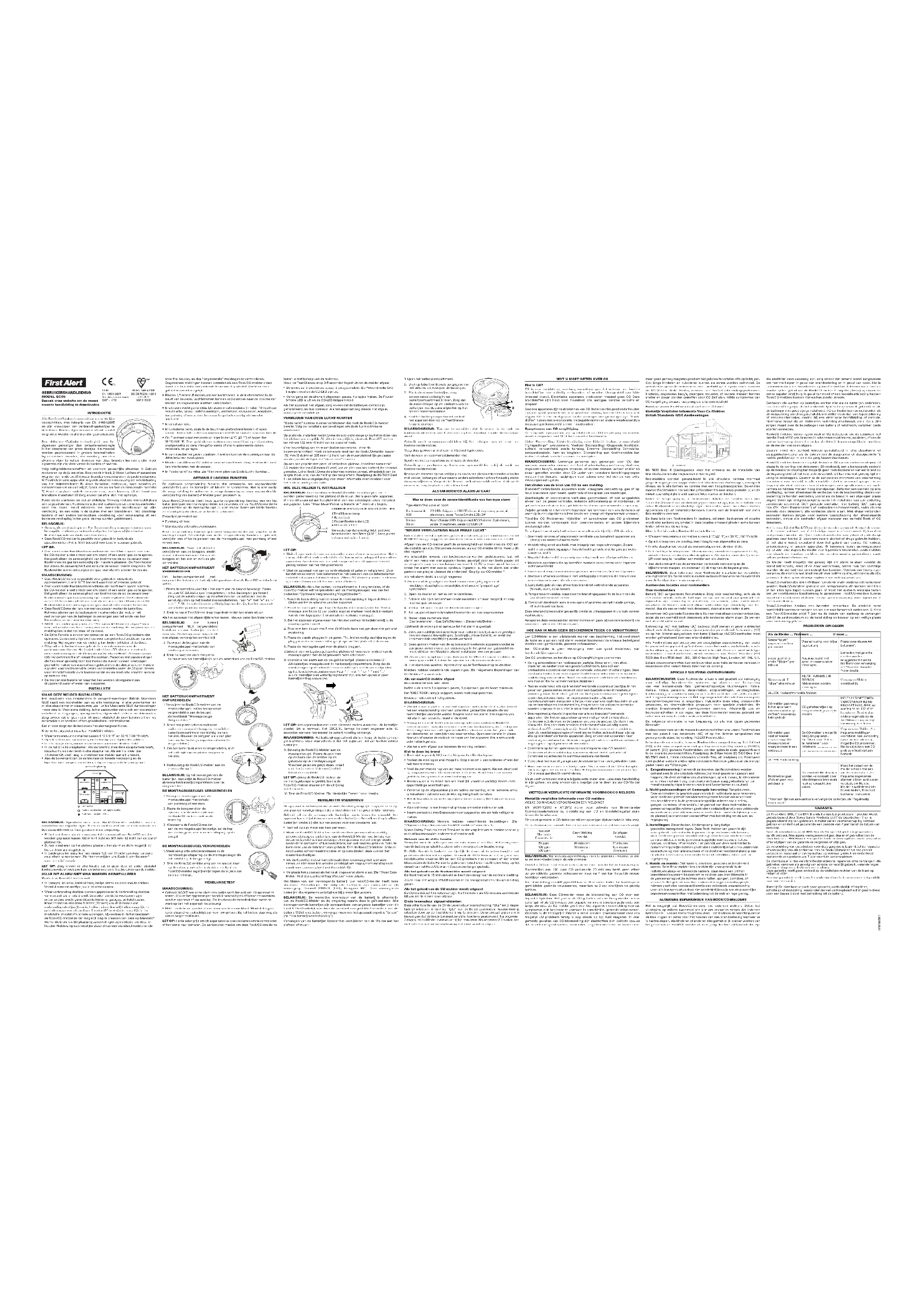 D’EMPOISONNEMENT AU CO, évacuez votre logement et appelez les urgences ou les pompiers. Sinon appuyez sur le bouton Test/Silence une fois de plus et continuez à ventiler votre logement. Le détecteur de CO se déclenche souvent alors que l’enquête ne révèle pas la présence d’un taux élevé de CO Le détecteur est peut-être mal placé. Consultez « Où installer ce détecteur » pour en savoir plus. Déplacez votre détecteur. Si le détecteur se déclenche souvent, faites à nouveau contrôler votre logement pour rechercher les éventuels problèmes de CO. Vous avez peut-être un problème de CO intermittent. Détecteur de fumée SEULEMENT : Le détecteur de fumée se déclenche alors qu’il n’y a pas de fumée visible Une fausse alarme peut être déclenchée par une source de fumée non liée à un incendie, comme de la fumée de cuisine. Nettoyez le boîtier du détecteur avec un chiffon doux et propre. Si les fausses alarmes continuent, déplacez votre détecteur. Le détecteur est peut- être trop proche d’une cuisine, d’une cuisinière ou d’une salle d’eau pleine de vapeur. *Pour une liste des piles de rechange compatibles, voir « Entretien régulier ». GARANTIE Ce produit First Alert, BRK, (« les produits BRK Brands Europe Ltd ») est distribué par Sprue Safety Products Ltd (« le Distributeur ») et le Distributeur garantit qu’il sera dépourvu de défauts de matériaux ou de main d’œuvre dans des conditions d’utilisation et de service normales pendant une période de 7 ans à compter de la date d’achat. Ni le Distributeur ni BRK Brands Europe Ltd ne donne de garanties pour ce produit. Aucun agent, représentant, revendeur ou employé du Distributeur ou de BRK Brands Europe Ltd n’est autorisé à augmenter ou modifier les obligations ou limitations de la garantie. Les obligations du Distributeur dans le cadre de cette garantie se limiteront à la réparation ou au remplacement des pièces du détecteur de fumée / monoxyde de carbone s’avérant présenter un défaut de matériaux ou de main d’œuvre dans des conditions normales d’utilisation et de service pendant la période de 7 ans suivant la date d’achat. Le Distributeur ne sera pas dans l’obligation de réparer les détecteurs de fumée ayant été endommagés, utilisés de manière abusive, ou modifiés après la date d’achat. Cette garantie n’affecte en rien les droits fondamentaux du client. Comment faire fonctionner la garantie Si une intervention est requise, ramenez le produit là où vous l’avez acheté. Piles : Le Distributeur ne fait aucune garantie explicite ou implicite, écrite ou orale, y compris une garantie de qualité marchande ou d’aptitude à une utilisation particulière en ce qui concerne les piles. MANUEL