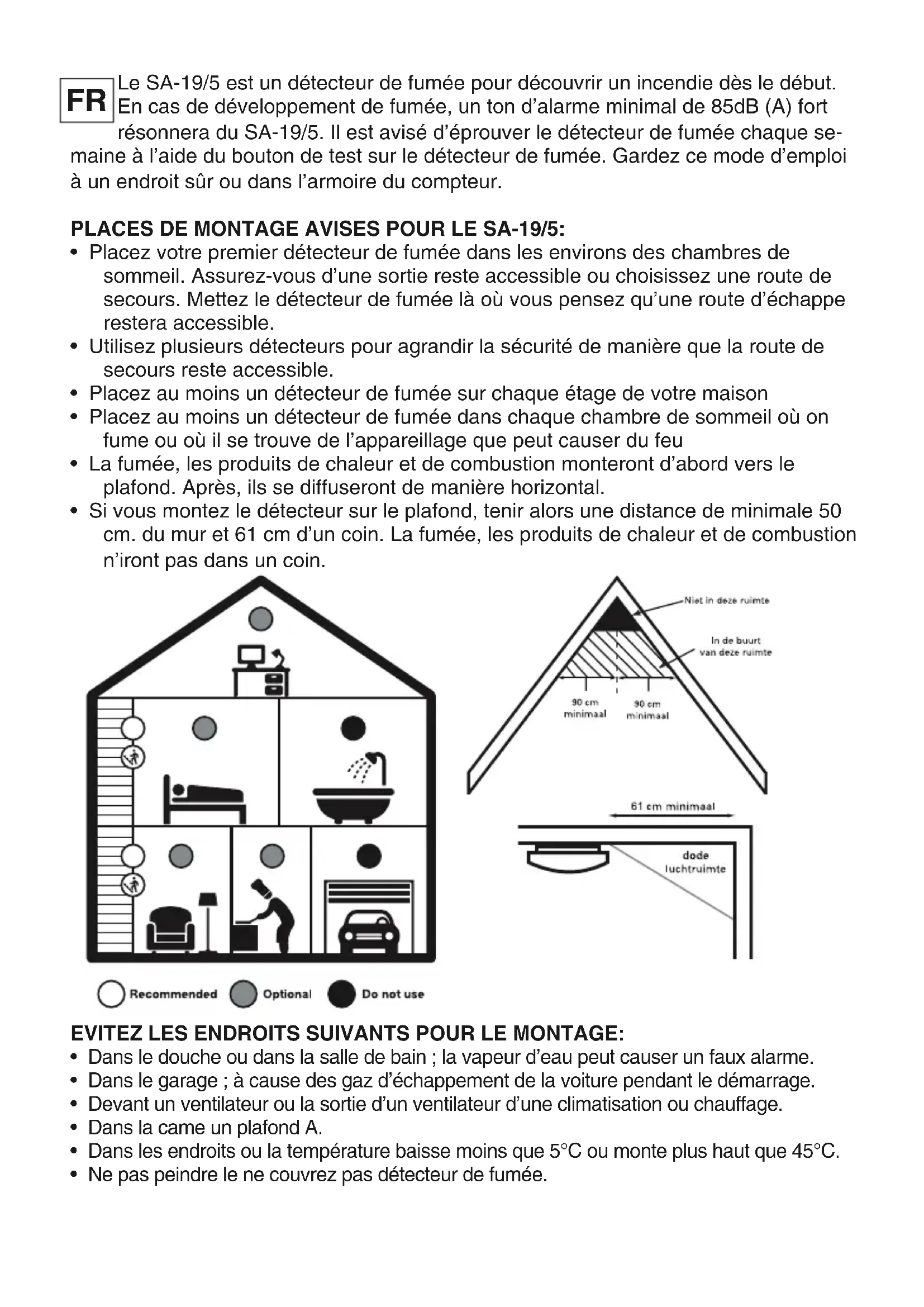 - Quand vous vous trouvez dehors, contactez le service d’incendie le plus vite que possible (112). REMPLACER LA PILE: Le détecteur est alimenté par une pile bloque de 9 Volt. Utilisez seulement les piles suivantes avisée Mustang 6LR61. Pendant un usage normal, la pile aura une longévité de 5 an au minimum. Quand la pile doit être remplacée, le détecteur produira un ton aigu toutes les 30 à 40 secondes. Ce ton continuera pendant 30 jours au minimum. Il n’est pas possible de fixer le détecteur sur le plafond sans avoir mis la plaque de pla- fond. Le détecteur ne peut pas être mis sur la plaque de plafond sans pile. Quand la pile a été bien mise, le détecteur peut être tourné simplement sur la plaque de plafond. Faites attention à la polarité en mettant une (nouvelle) pile. ENVIRONNEMENT: Ne jetez pas les piles vides aux ordures ménagères mais rendez les à votre dêpot local des déchets chimiques. Au terme du cycle de vie de ce produit, vous ne devez pas jeter le produit dans les déchets ménagers ordinaires mais le déposer dans un point de collecte pour le recyclage des équipements électriques et électroniques. DECLARATION OF CONFORMITY: Elle peut être téléchargée de notre site www.alecto.nl.Das SA-19/5 Gerät ist ein Rauchmelder, der die Entwicklung von Rauch schon in der ersten Phase erkennt. Bei Rauchentwicklung wird der SA-19/5 ein lautes Alarmsignal von minimal 85dB (A) von sich geben. Es wird empfohlen, jede Woche den Rauchmelder durch Betätigung des Testknopfes zu überprüfen. Bewahren Sie diese Gebrauchsanweisung an einem geeigneten Platz auf. GEEIGNETE MONTAGEPLÄTZE FÜR DAS SA-19/5 GERÄT: