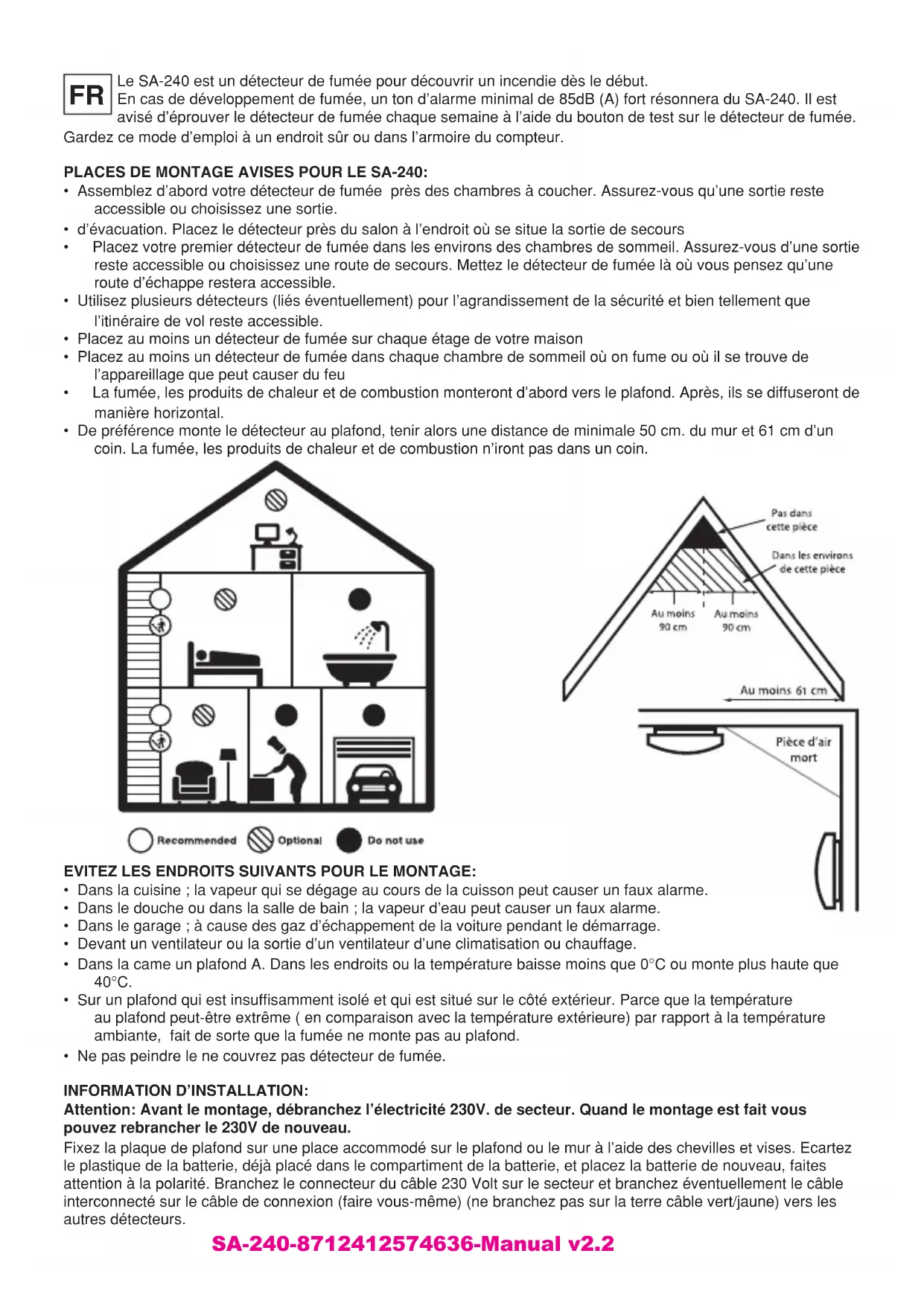 SA-240-8712412574636-Manual v2.2Le SA-240 est un détecteur de fumée pour découvrir un incendie dès le début. En cas de développement de fumée, un ton d’alarme minimal de 85dB (A) fort résonnera du SA-240. Il est avisé d’éprouver le détecteur de fumée chaque semaine à l’aide du bouton de test sur le détecteur de fumée. Gardez ce mode d’emploi à un endroit sûr ou dans l’armoire du compteur. PLACES DE MONTAGE AVISES POUR LE SA-240: