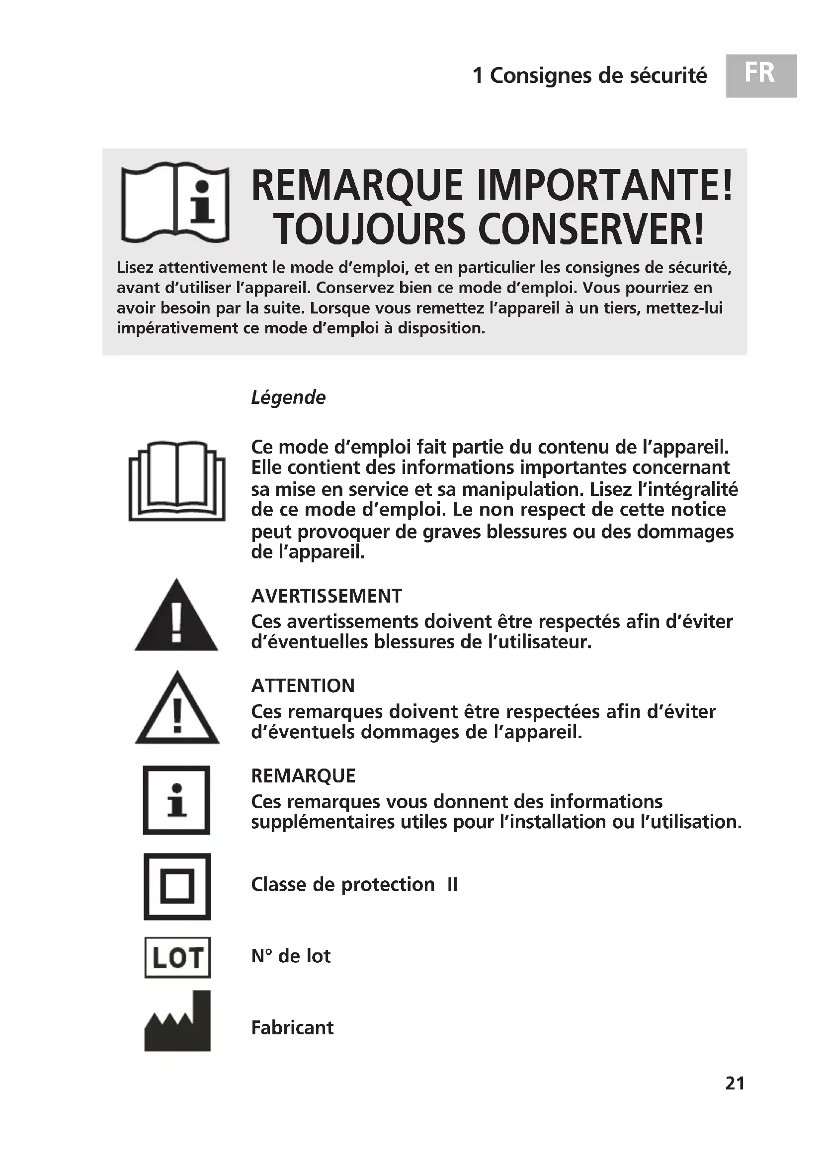 1 Consignes de sécurité REMARQUE IMPORTANTE! TOUJOURS CONSERVER! Ce mode d’emploi fait partie du contenu de l’appareil. Elle contient des informations importantes concernant sa mise en service et sa manipulation. Lisez l’intégralité de ce mode d’emploi. Le non respect de cette notice peut provoquer de graves blessures ou des dommages de l’appareil. AVERTISSEMENT Ces avertissements doivent être respectés afin d’éviter d’éventuelles blessures de l’utilisateur. ATTENTION Ces remarques doivent être respectées afin d’éviter d’éventuels dommages de l’appareil. REMARQUE Ces remarques vous donnent des informations supplémentaires utiles pour l’installation ou l’utilisation. Classe de protection II N° de lot Fabricant Lisez attentivement le mode d’emploi, et en particulier les consignes de sécurité,avant d’utiliser l’appareil. Conservez bien ce mode d’emploi. Vous pourriez en avoir besoin par la suite. Lorsque vous remettez l’appareil à un tiers, mettez-luiimpérativement ce mode d’emploi à disposition. Légende