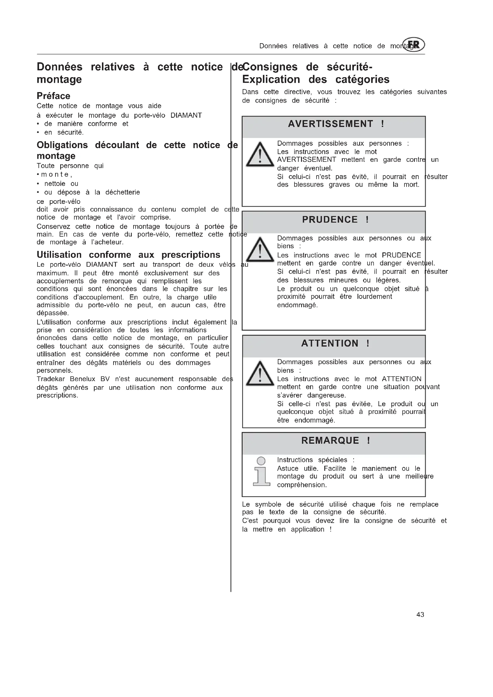 Conservez cette notice de montage toujours à portée de main. En cas de vente du porte-vélo, remettez cette not de montage à l'acheteur.