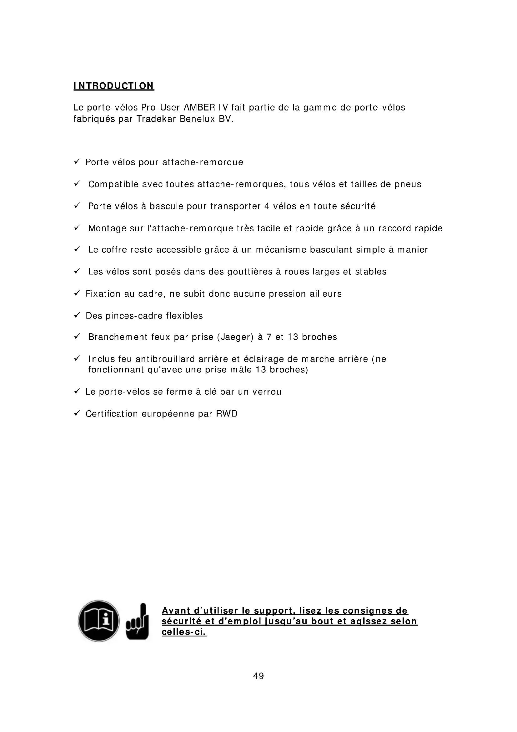 Les étapes reprises et les instructions en matière de sécurité pour le montage, le maniement et l'utilisation du porte-velos doivent être rigoureusement suivies. La moindre divergence peut mener à un mauvais montage ou à une utilisation erronée.
