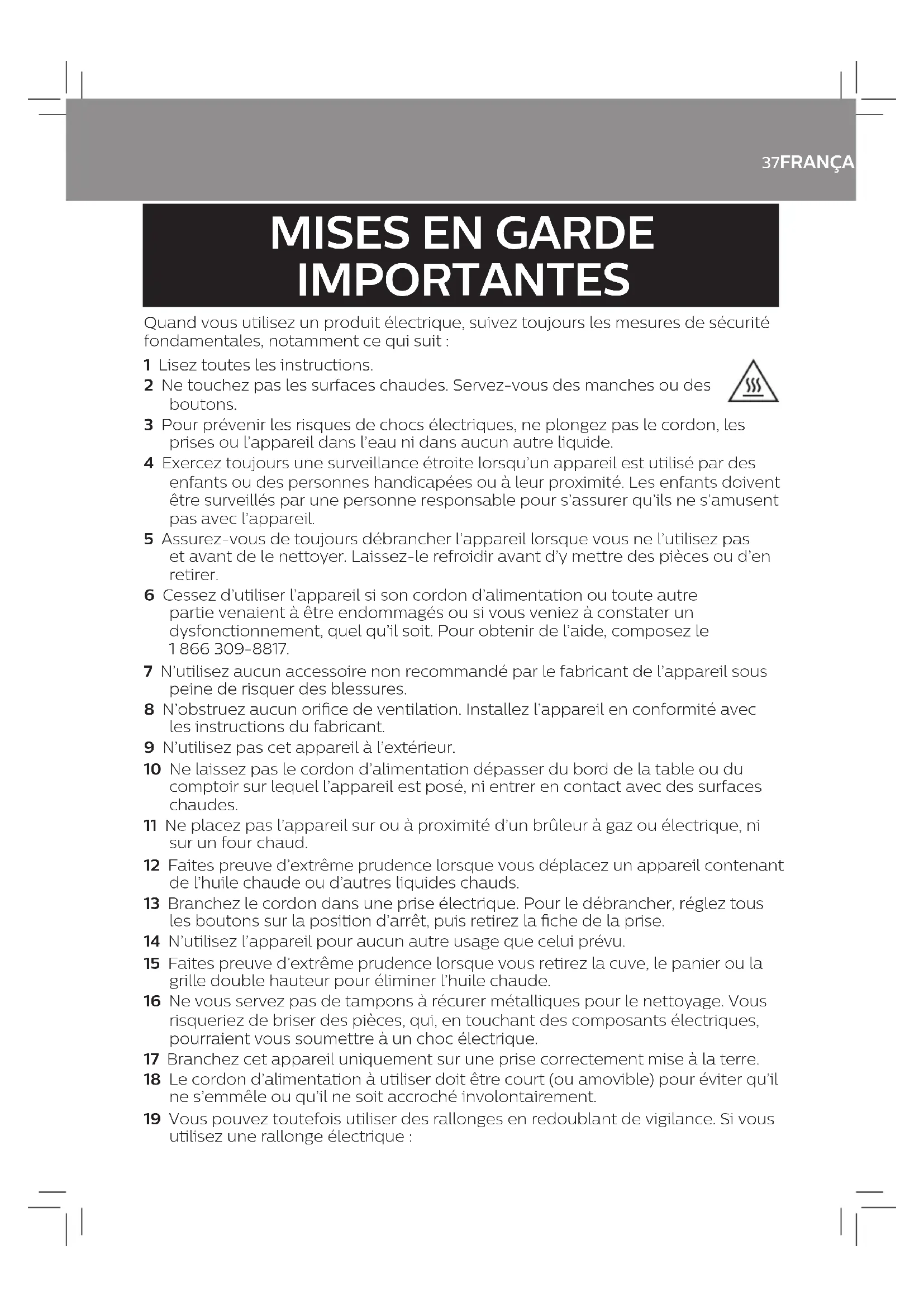 IMPORTANTES Quand vous utilisez un produit électrique, suivez toujours les mesures de sécurité fondamentales, notamment ce qui suit : 1 Lisez toutes les instructions. 2 Ne touchez pas les surfaces chaudes. Servez-vous des manches ou des boutons. 3 Pour prévenir les risques de chocs électriques, ne plongez pas le cordon, les prises ou l’appareil dans l’eau ni dans aucun autre liquide. 4 Exercez toujours une surveillance étroite lorsqu’un appareil est utilisé par des enfants ou des personnes handicapées ou à leur proximité. Les enfants doivent être surveillés par une personne responsable pour s’assurer qu’ils ne s’amusent pas avec l’appareil. 5 Assurez-vous de toujours débrancher l’appareil lorsque vous ne l’utilisez pas et avant de le nettoyer. Laissez-le refroidir avant d’y mettre des pièces ou d’en retirer. 6 Cessez d’utiliser l’appareil si son cordon d’alimentation ou toute autre partie venaient à être endommagés ou si vous veniez à constater un dysfonctionnement, quel qu’il soit. Pour obtenir de l’aide, composez le 1 866 309-8817. 7 N’utilisez aucun accessoire non recommandé par le fabricant de l’appareil sous peine de risquer des blessures. 8 N’obstruez aucun orice de ventilation. Installez l’appareil en conformité avec les instructions du fabricant. 9 N’utilisez pas cet appareil à l’extérieur. 10 Ne laissez pas le cordon d’alimentation dépasser du bord de la table ou du comptoir sur lequel l’appareil est posé, ni entrer en contact avec des surfaces chaudes. 11 Ne placez pas l’appareil sur ou à proximité d’un brûleur à gaz ou électrique, ni sur un four chaud. 12 Faites preuve d’extrême prudence lorsque vous déplacez un appareil contenant de l’huile chaude ou d’autres liquides chauds. 13 Branchez le cordon dans une prise électrique. Pour le débrancher, réglez tous les boutons sur la position d’arrêt, puis retirez la che de la prise. 14 N’utilisez l’appareil pour aucun autre usage que celui prévu. 15 Faites preuve d’extrême prudence lorsque vous retirez la cuve, le panier ou la grille double hauteur pour éliminer l’huile chaude. 16 Ne vous servez pas de tampons à récurer métalliques pour le nettoyage. Vous risqueriez de briser des pièces, qui, en touchant des composants électriques, pourraient vous soumettre à un choc électrique. 17 Branchez cet appareil uniquement sur une prise correctement mise à la terre. 18 Le cordon d’alimentation à utiliser doit être court (ou amovible) pour éviter qu’il ne s’emmêle ou qu’il ne soit accroché involontairement. 19 Vous pouvez toutefois utiliser des rallonges en redoublant de vigilance. Si vous utilisez une rallonge électrique :38 FRANÇAIS - Les caractéristiques électriques du cordon d’alimentation doivent être aussi élevées que celles de l’appareil. - La rallonge doit être disposée de façon à ne pas reposer au bord d’une table ou d’un comptoir, car un enfant pourrait alors facilement l’attraper ou quelqu’un pourrait se prendre les pieds dedans. - Si la che de l’appareil est munie d’un l de terre, la rallonge utilisée doit être un cordon d’alimentation trilaire avec mise à la terre. 20 Cet appareil est doté d’une che polarisée (une broche est plus large que l’autre). Cette che ne peut être insérée que d’une seule façon dans une prise polarisée. Si la che ne s’adapte pas parfaitement à la prise, essayez dans l’autre sens. Si la che n’est toujours pas compatible, communiquez avec un électricien qualié. Ne tentez en aucun cas de la modier par vous-même. 21 N’insérez ni aliment trop gros ni ustensile en métal dans l’appareil, car vous risqueriez de provoquer un incendie ou d’être soumis à un choc électrique. 22 Un incendie pourrait se déclarer si l’appareil est en contact avec des matériaux inammables tels que des rideaux, des tentures ou un mur, pendant qu’il fonctionne. Ne posez aucun objet sur l’appareil en cours d’utilisation. 23 Ne mettez aucun objet en papier, en carton, en plastique ou matière similaire dans l’appareil. 24 Débranchez immédiatement l’appareil si vous apercevez de la fumée noire en sortir. Attendez que l’émission de fumée cesse avant de retirer la cuve de l’appareil. 25 Utilisez l’appareil sur une surface plane, stable et résistante à la chaleur, loin de toute source d’eau ou de chaleur. 26 Ne laissez pas l’appareil sans surveillance en cours d’utilisation. 27 Cet appareil fonctionne à des températures élevées qui peuvent causer des brûlures. Ne touchez pas les surfaces chaudes ni les pièces à l’intérieur de l’appareil pendant qu’il fonctionne. Laissez refroidir complètement l’appareil avant de le manipuler ou de le nettoyer. 28 Pendant la friture à l’air chaud, de la vapeur brûlante s’échappe des sorties d’air. Gardez les mains et le visage susamment éloignés des sorties d’air. 29 Évitez tout contact avec les pièces mobiles. 30 Cet appareil fonctionne à l’air chaud seulement; la nourriture n’est pas frite dans l’huile ou dans la graisse! Ne remplissez jamais la cuve avec de l’huile ou de la matière grasse. 31 Cet appareil est destiné à un usage domestique seulement. 32 N’utilisez jamais l’Airfryer sans la cuve et le panier à l’intérieur. 33 Assurez-vous que la poignée est assemblée et serrée correctement. 34 N’utilisez pas le bouchon dans ou à proximité d’une prise d’alimentation qui contient un désodorisant électrique, et ce an d’éviter tout dommage de le bouchon. 35 Ne jamais mettre d’ingrédients légers ou de papier parchemin dans l’appareil. 36 Ne touchez jamais l’intérieur de l’appareil pendant qu’il fonctionne. 37 Ne placez jamais l’appareil sur ou à proximité de matériaux combustibles, comme une nappe ou des rideaux. 38 Ne laissez jamais l’appareil fonctionner sans surveillance. 39 Débranchez immédiatement l’app