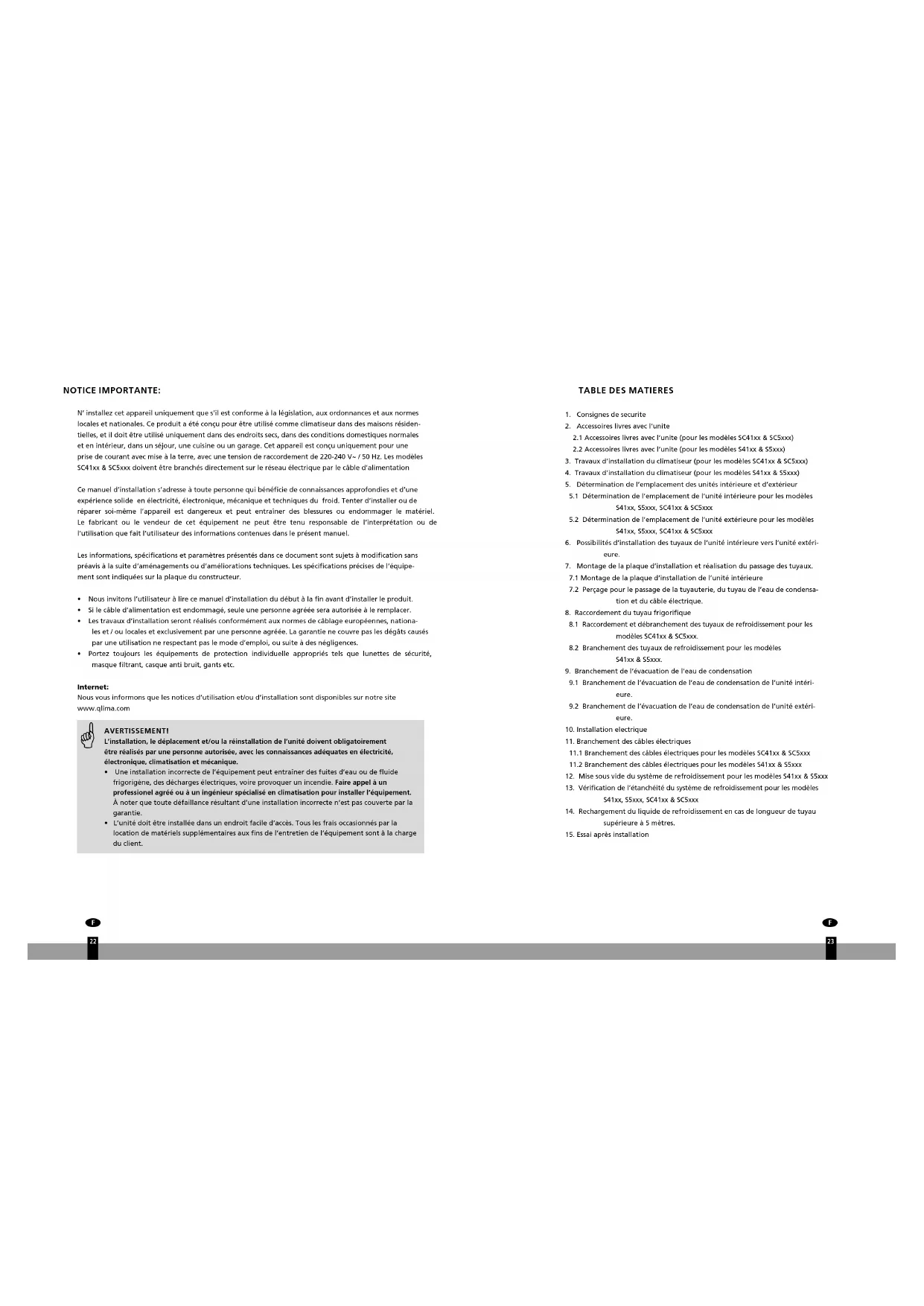 NOTICE IMPORTANTE: N’ installez cet appareil uniquement que s’il est conforme à la législation, aux ordonnances et aux normes locales et nationales. Ce produit a été conçu pour être utilisé comme climatiseur dans des maisons résiden- tielles, et il doit être utilisé uniquement dans des endroits secs, dans des conditions domestiques normales et en intérieur, dans un séjour, une cuisine ou un garage. Cet appareil est conçu uniquement pour une prise de courant avec mise à la terre, avec une tension de raccordement de 220-240 V~ / 50 Hz. Les modèles SC41xx & SC5xxx doivent être branchés directement sur le réseau électrique par le câble d’alimentation Ce manuel d’installation s’adresse à toute personne qui bénéficie de connaissances approfondies et d’une expérience solide en électricité, électronique, mécanique et techniques du froid. Tenter d’installer ou de réparer soi-même l’appareil est dangereux et peut entraîner des blessures ou endommager le matériel. Le fabricant ou le vendeur de cet équipement ne peut être tenu responsable de l’interprétation ou de l’utilisation que fait l’utilisateur des informations contenues dans le présent manuel. Les informations, spécifications et paramètres présentés dans ce document sont sujets à modification sans préavis à la suite d’aménagements ou d’améliorations techniques. Les spécifications précises de l’équipe- ment sont indiquées sur la plaque du constructeur.