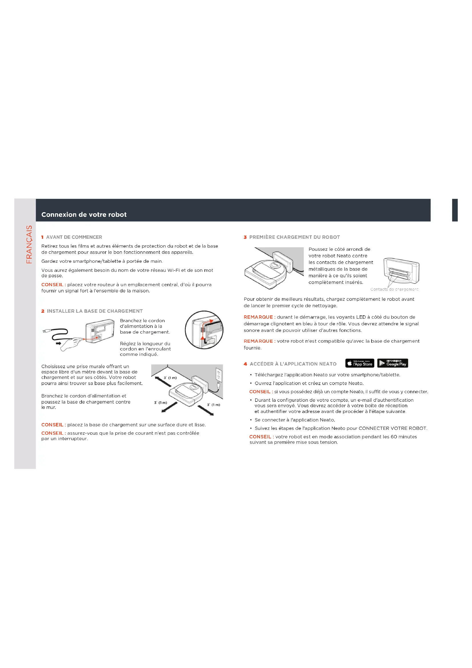 - Batteries – every 12 to 18 months User guide can be found at www.NeatoRobotics.com/UG Watch How–To Video here www.NeatoRobotics.com/support1 AVANT DE COMMENCER Retirez tous les films et autres éléments de protection du robot et de la base de chargement pour assurer le bon fonctionnement des appareils. Gardez votre smartphone/tablette à portée de main. Vous aurez également besoin du nom de votre réseau Wi-Fi et de son mot depasse. CONSEIL: placez votre routeur à un emplacement central, d'où il pourra fournir un signal fort à l'ensemble de la maison.
