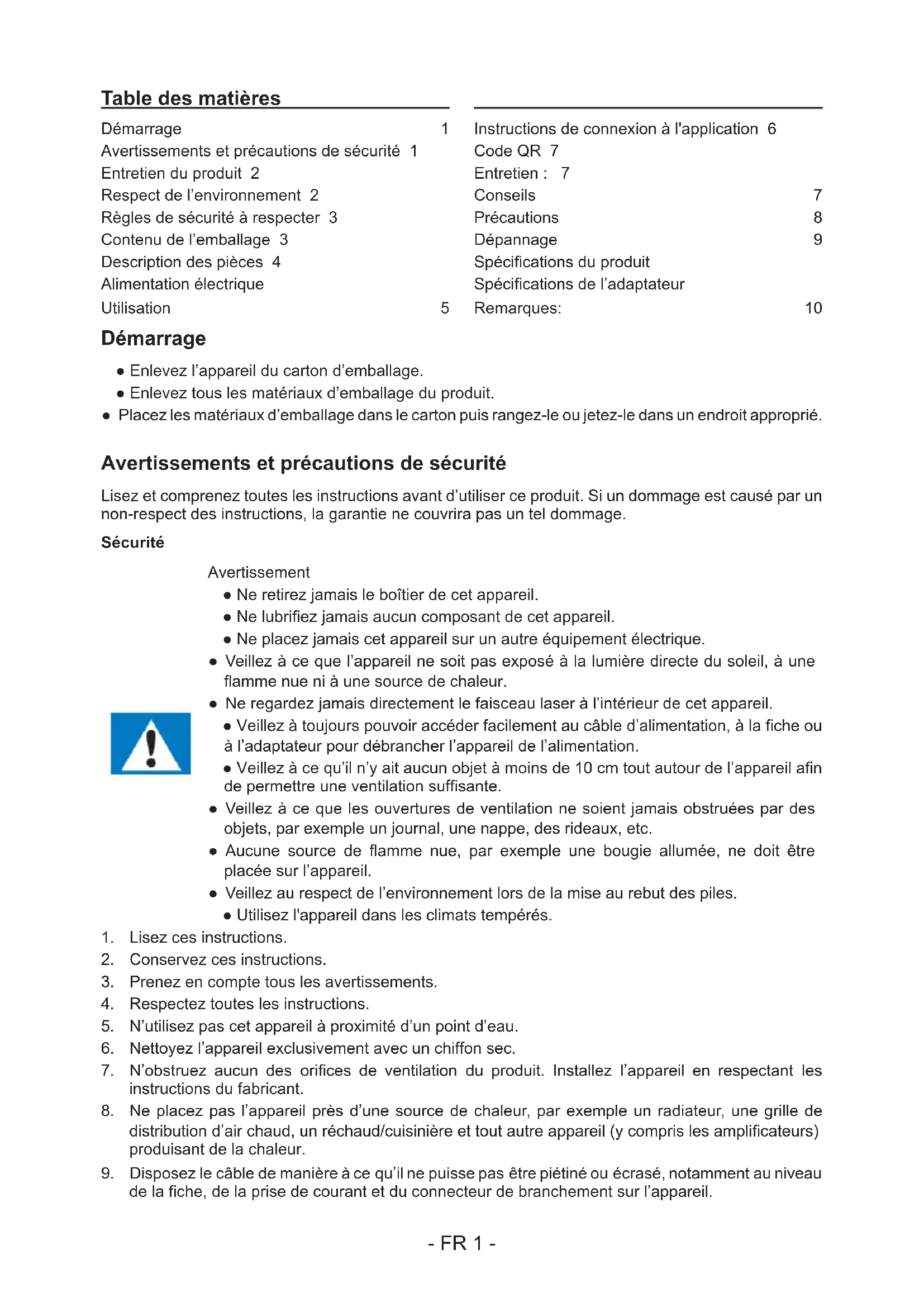 | Avertissements et précautions de sécurité 1 | Code QR 7 | ||