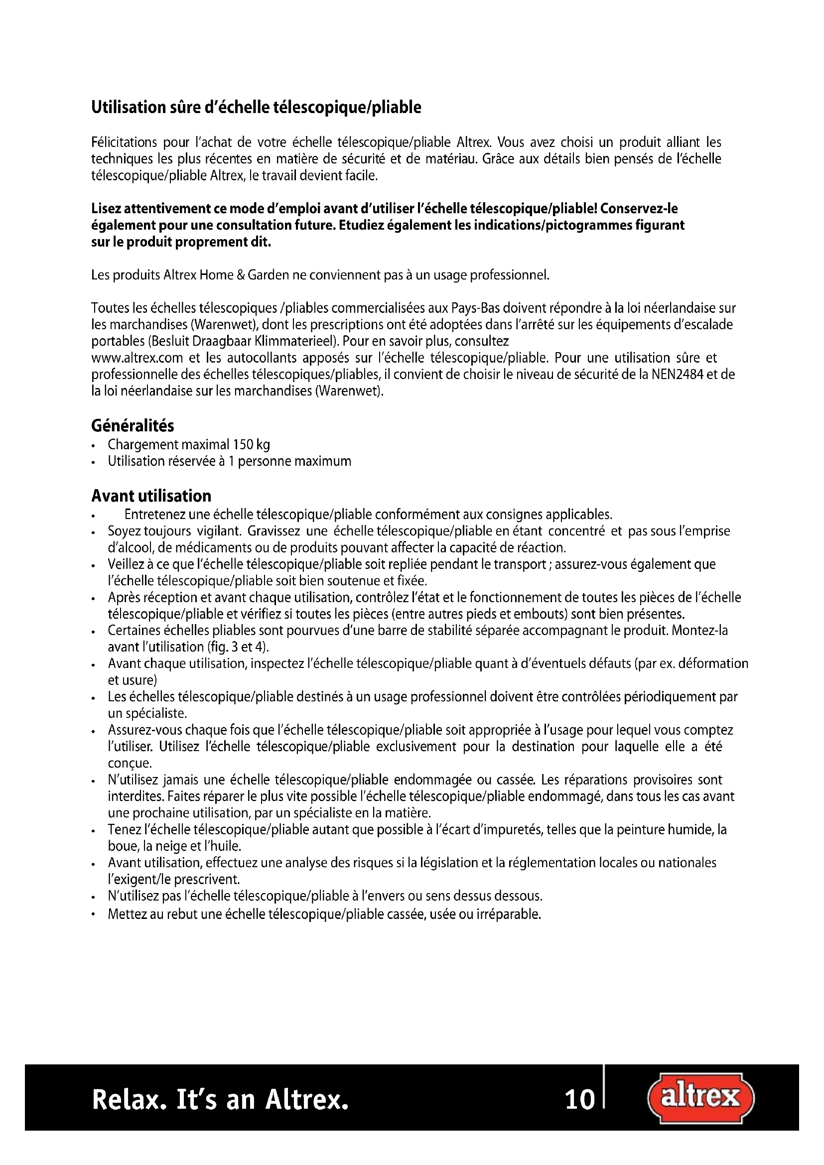 b.Utilisation sûre d’échelle télescopique/pliable Félicitations pour l’achat de votre échelle télescopique/pliable Altrex. Vous avez choisi un produit alliant les techniques les plus récentes en matière de sécurité et de matériau. Grâce aux détails bien pensés de l’échelle télescopique/pliable Altrex, le travail devient facile. Lisez attentivement ce mode d’emploi avant d’utiliser l’échelle télescopique/pliable! Conservez-le également pour une consultation future. Etudiez également les indications/pictogrammes figurant sur le produit proprement dit. Les produits Altrex Home & Garden ne conviennent pas à un usage professionnel. Toutes les échelles télescopiques /pliables commercialisées aux Pays-Bas doivent répondre à la loi néerlandaise sur les marchandises (Warenwet), dont les prescriptions ont été adoptées dans l’arrêté sur les équipements d’escalade portables (Besluit Draagbaar Klimmaterieel). Pour en savoir plus, consultez www.altrex.com et les autocollants apposés sur l’échelle télescopique/pliable. Pour une utilisation sûre et professionnelle des échelles télescopiques/pliables, il convient de choisir le niveau de sécurité de la NEN2484 et de la loi néerlandaise sur les marchandises (Warenwet). Généralités Chargement maximal 150 kg Utilisation réservée à 1 personne maximum Avant utilisation Entretenez une échelle télescopique/pliable conformément aux consignes applicables. Soyez toujours vigilant. Gravissez une échelle télescopique/pliable en étant concentré et pas sous l’emprise d’alcool, de médicaments ou de produits pouvant affecter la capacité de réaction. Veillez à ce que l’échelle télescopique/pliable soit repliée pendant le transport ; assurez-vous également que l’échelle télescopique/pliable soit bien soutenue et fixée. Après réception et avant chaque utilisation, contrôlez l’état et le fonctionnement de toutes les pièces de l’échelle télescopique/pliable et vérifiez si toutes les pièces (entre autres pieds et embouts) sont bien présentes. Certaines échelles pliables sont pourvues d’une barre de stabilité séparée accompagnant le produit. Montez-la avant l’utilisation (fig. 3 et 4). Avant chaque utilisation, inspectez l’échelle télescopique/pliable quant à d’éventuels défauts (par ex. déformation et usure) Les échelles télescopique/pliable destinés à un usage professionnel doivent être contrôlées périodiquement par un spécialiste. Assurez-vous chaque fois que l’échelle télescopique/pliable soit appropriée à l’usage pour lequel vous comptez l’utiliser. Utilisez l’échelle télescopique/pliable exclusivement pour la destination pour laquelle elle a été conçue. N’utilisez jamais une échelle télescopique/pliable endommagée ou cassée. Les réparations provisoires sont interdites. Faites réparer le plus vite possible l’échelle télescopique/pliable endommagé, dans tous les cas avant une prochaine utilisation, par un spécialiste en la matière. Tenez l’échelle télescopique/pliable autant que possible à l’écart d’impuretés, telles que la peinture humide, la boue, la neige et l’huile. Avant utilisation, effectuez une analyse des risques si la législation et la réglementation locales ou nationales l’exigent/le prescrivent. N’utilisez pas l’échelle télescopique/pliable à l’envers ou sens dessus dessous. Mettez au rebut une échelle télescopique/pliable cassée, usée ou irréparable.