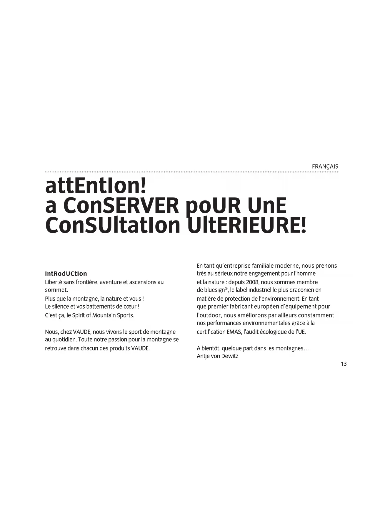 - Do not stake out the guy lines over paths or trails. These can be easily tripped over in the dark. ENGLISH13 FRANÇAIS IntRodUCtIon Liberté sans frontière, aventure et ascensions au sommet. Plus que la montagne, la nature et vous ! Le silence et vos battements de cœur ! C’est ça, le Spirit of Mountain Sports. Nous, chez VAUDE, nous vivons le sport de montagne au quotidien. Toute notre passion pour la montagne se retrouve dans chacun des produits VAUDE. En tant qu’entreprise familiale moderne, nous prenons très au sérieux notre engagement pour l’homme et la nature : depuis 2008, nous sommes membre de bluesign®, le label industriel le plus draconien en matière de protection de l’environnement. En tant que premier fabricant européen d’équipement pour l’outdoor, nous améliorons par ailleurs constamment nos performances environnementales grâce à la certification EMAS, l’audit écologique de l’UE. A bientôt, quelque part dans les montagnes… Antje von Dewitz attEntIon! a ConSERVER poUR UnE ConSUltatIon UltERIEURE!14 FRANÇAIS CHOIX DE L’EMPLACEMENT :