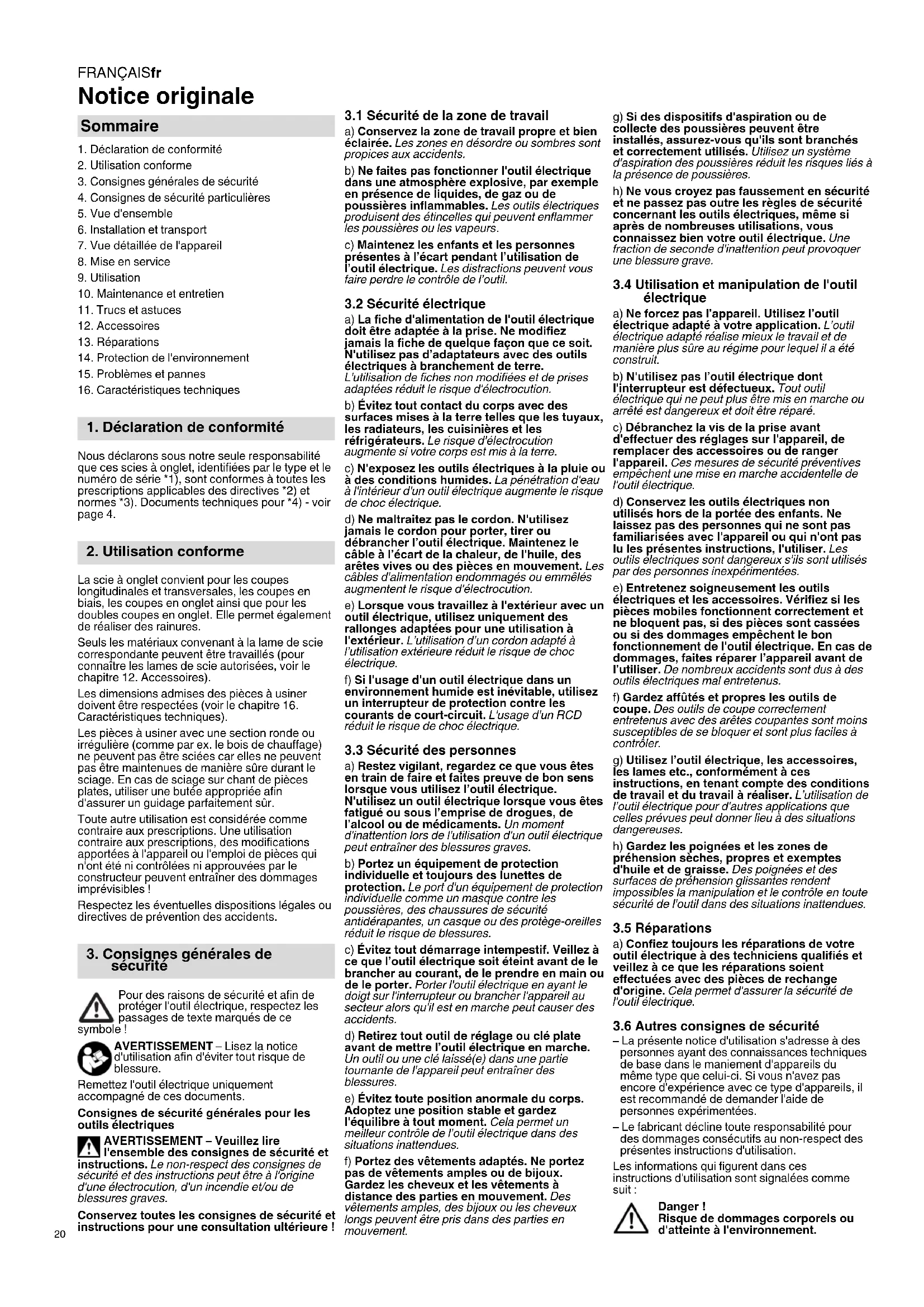 qui ont des cheveux longs doivent impérativement porter un filet à cheveux). Ne sciez jamais des pièces comportant des cordes, des ficelles, des bandes, des câbles, des fils ou tout autre matériel du même type. Risque lié à un équipement de protection individuelle insuffisant ! Portez des protège-oreilles. Portez des lunettes de protection. Portez un masque antipoussières. Portez des vêtements de travail adaptés. Portez des chaussures antidérapantes. Portez des gants lorsque vous manipulez des lames de scie et des outils raboteux. Transportez les lames de scie dans un récipient. Risque lié aux sciures de bois ! Ne travaillez qu'avec un dispositif d'aspiration. Le dispositif d'aspiration doit être conforme aux valeurs indiquées dans le chapitre 16.. Réduction de la pollution aux particules fines : AVERTISSEMENT - Certaines poussières produites par le ponçage électrique, le sciage, le meulage, le perçage et d’autres activités de construction contiennent des agents chimiques qui causent des cancers, des anomalies congénitales ou d’autres dangers pour la reproduction. Voici quelques exemples de tels agents chimiques : - Le plomb des peintures à base de plomb, - La silice cristalline des briques, du ciment et d’autres produits de maçonnerie, et - L’arsenic et le chrome du bois d'œuvre traité chimiquement. Les conséquences de telles expositions varient en fonction de la fréquence à laquelle vous faites ce type de travail. Pour réduire votre exposition à ces agents chimiques, travaillez dans un endroit bien ventilé et utilisez des équipements de protection agréés, tels que les masques de protection contre la poussière qui sont conçus spécialement pour filtrer les particules microscopiques. Cela vaut également pour les poussières d’autres matériaux, comme par exemple certains types de bois (comme la poussière de chêne ou de hêtre), de métaux et l’amiante. D’autres maladies connues incluent par exemple les réactions allergiques et les affections des voies respiratoires. Il est souhaitable que le corps n’absorbe pas ces poussières. Respectez les directives et les dispositions locales applicables au matériau, au personnel, à l’application et au lieu d’utilisation (par exemple directives en matière de sécurité au travail, élimination des déchets). Collecter les particules émises sur le lieu d’émission et éviter les dépôts dans l’environnement. Utiliser des accessoires adaptés pour les travaux spécifiques. Cela permet d’éviter l’émission incontrôlée de particules dans l’environnement. Utiliser un système d'aspiration des poussières adapté. Réduire l’émission de poussières en : - évitant d'orienter les particules sortantes et l'air d'échappement de la machine vers vous ou vers des personnes se trouvant à proximité ou vers des dépôts de poussière, - utilisant un système d’aspiration et/ou un purificateur d’air, - aérant convenablement le lieu de travail et en l’aspirant pour le maintenir propre. Balayer ou souffler les poussières les fait tourbillonner. - Aspirer ou laver les vêtements de protection. Ne pas les souffler, les battre, ni les brosser. Danger en cas de modifications apportées à l'appareil ou d'utilisation de pièces qui n'ont été ni contrôlées ni approuvées par le fabricant Montez l'appareil en respectant scrupuleusement les présentes instructions. N'utilisez que des pièces de rechange agréées par le fabricant. Cela concerne en particulier : – Les lames de scie (numéros de commande, voir le chapitre 12. Accessoires). – Les dispositifs de sécurité. – Les lasers de coupe. – Éclairage de la zone de coupe. Ne modifiez pas les pièces de l'appareil. Veillez à ce que la vitesse indiquée sur la lame de scie soit au moins aussi élevée que celle indiquée sur la scie. Risque lié à un défaut de l'appareil ! Vérifiez si l'appareil n'est pas endommagé avant chaque utilisation. Avant de réutiliser l'appareil, le bon fonctionnement des dispositifs de sécurité, des dispositifs de protection ou des pièces légèrement endommagées doit être contrôlé. Assurez-vous que les pièces mobiles fonctionnent correctement et ne se bloquent pas. Toutes les pièces doivent être montées correctement et satisfaire à toutes les conditions nécessaires pour garantir le parfait fonctionnement de l'appareil. N'utilisez pas des lames de scie endommagées ou déformées. Risque lié au bruit ! Portez des protège-oreilles. Risque lié à des pièces ou à des parties de pièces à usiner qui bloquent ! En cas de blocage :