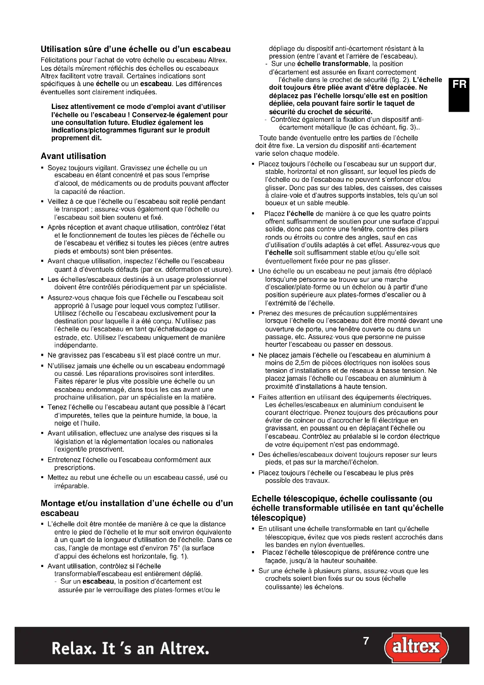 Utilisation sûre d’une échelle ou d’un escabeau Félicitations pour l‟achat de votre échelle ou escabeau Altrex. Les détails mûrement réfléchis des échelles ou escabeaux Altrex facilitent votre travail. Certaines indications sont spécifiques à une échelle ou un escabeau. Les différences éventuelles sont clairement indiquées. Lisez attentivement ce mode d’emploi avant d’utiliser l’échelle ou l’escabeau ! Conservez-le également pour une consultation future. Etudiez également les indications/pictogrammes figurant sur le produit proprement dit. Avant utilisation Soyez toujours vigilant. Gravissez une échelle ou un escabeau en étant concentré et pas sous l‟emprise d‟alcool, de médicaments ou de produits pouvant affecter la capacité de réaction. Veillez à ce que l‟échelle ou l‟escabeau soit replié pendant le transport ; assurez-vous également que l‟échelle ou l‟escabeau soit bien soutenu et fixé. Après réception et avant chaque utilisation, contrôlez l‟état et le fonctionnement de toutes les pièces de l‟échelle ou de l‟escabeau et vérifiez si toutes les pièces (entre autres pieds et embouts) sont bien présentes. Avant chaque utilisation, inspectez l‟échelle ou l‟escabeau quant à d‟éventuels défauts (par ex. déformation et usure). Les échelles/escabeaux destinés à un usage professionnel doivent être contrôlés périodiquement par un spécialiste. Assurez-vous chaque fois que l‟échelle ou l‟escabeau soit approprié à l‟usage pour lequel vous comptez l‟utiliser. Utilisez l‟échelle ou l‟escabeau exclusivement pour la destination pour laquelle il a été conçu. N‟utilisez pas l‟échelle ou l‟escabeau en tant qu‟échafaudage ou estrade, etc. Utilisez l‟escabeau uniquement de manière indépendante. Ne gravissez pas l‟escabeau s‟il est placé contre un mur. N‟utilisez jamais une échelle ou un escabeau endommagé ou cassé. Les réparations provisoires sont interdites. Faites réparer le plus vite possible une échelle ou un escabeau endommagé, dans tous les cas avant une prochaine utilisation, par un spécialiste en la matière. Tenez l‟échelle ou l‟escabeau autant que possible à l‟écart d‟impuretés, telles que la peinture humide, la boue, la neige et l‟huile. Avant utilisation, effectuez une analyse des risques si la législation et la réglementation locales ou nationales l‟exigent/le prescrivent. Entretenez l‟échelle ou l‟escabeau conformément aux prescriptions. Mettez au rebut une échelle ou un escabeau cassé, usé ou irréparable. Montage et/ou installation d’une échelle ou d’un escabeau L‟échelle doit être montée de manière à ce que la distance entre le pied de l‟échelle et le mur soit environ équivalente à un quart de la longueur d‟utilisation de l‟échelle. Dans ce cas, l‟angle de montage est d‟environ 75° (la surface d‟appui des échelons est horizontale, fig. 1). Avant utilisation, contrôlez si l‟échelle transformable/l‟escabeau est entièrement déplié. - Sur un escabeau, la position d‟écartement est assurée par le verrouillage des plates-formes et/ou le
