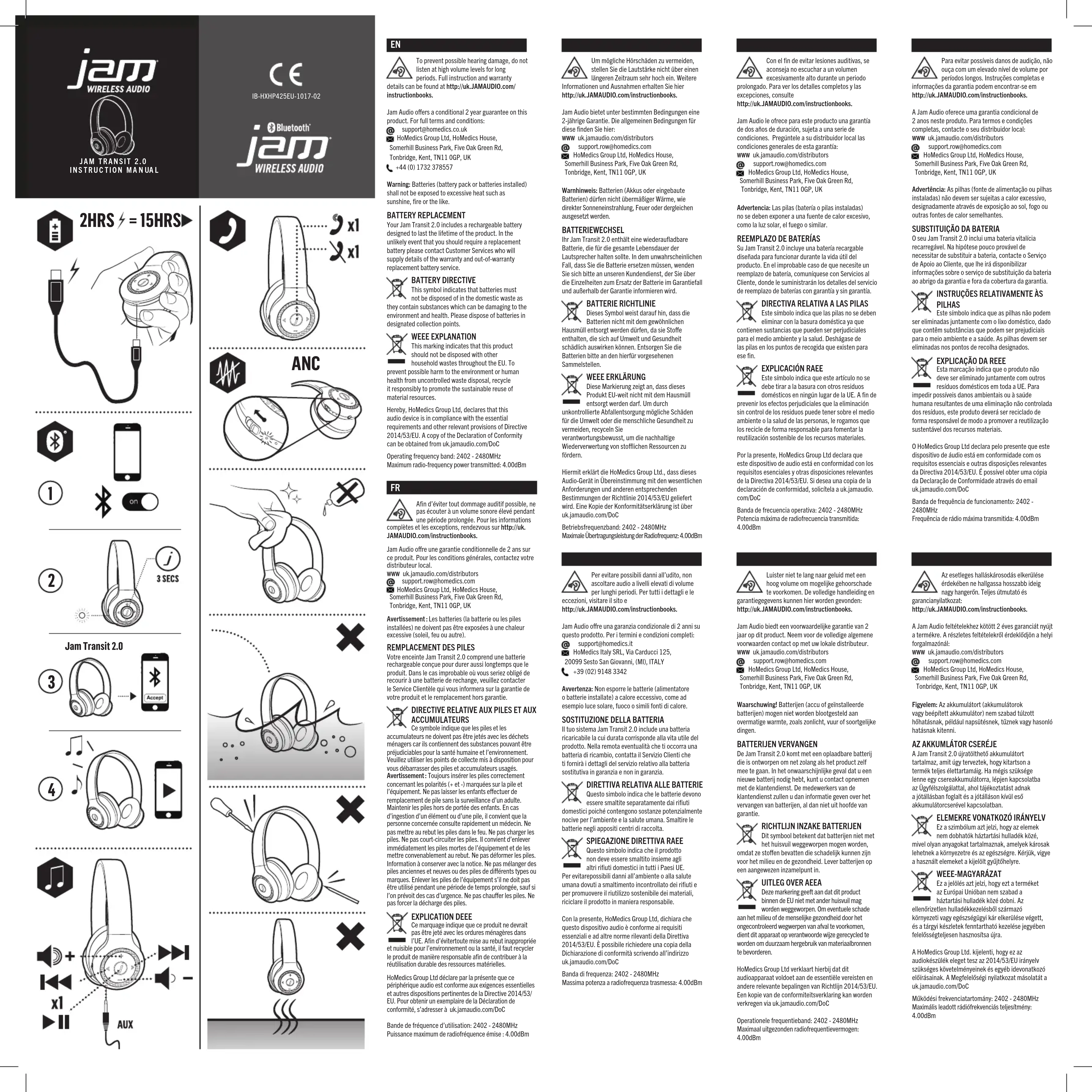 ACCUMULATEURS Ce symbole indique que les piles et les accumulateurs ne doivent pas être jetés avec les déchets ménagers car ils contiennent des substances pouvant être préjudiciables pour la santé humaine et l’environnement. Veuillez utiliser les points de collecte mis à disposition pour vous débarrasser des piles et accumulateurs usagés.Avertissement : Toujours insérer les piles correctement concernant les polarités (+ et -) marquées sur la pile et l’équipement. Ne pas laisser les enfants eectuer de remplacement de pile sans la surveillance d’un adulte. Maintenir les piles hors de portée des enfants. En cas d’ingestion d’un élément ou d’une pile, il convient que la personne concernée consulte rapidement un médecin. Ne pas mettre au rebut les piles dans le feu. Ne pas charger les piles. Ne pas court-circuiter les piles. Il convient d’enlever immédiatement les piles mortes de l’équipement et de les mettre convenablement au rebut. Ne pas déformer les piles. Information à conserver avec la notice. Ne pas mélanger des piles anciennes et neuves ou des piles de diérents types ou marques. Enlever les piles de l’équipement s’il ne doit pas être utilisé pendant une période de temps prolongée, sauf si l’on prévoit des cas d’urgence. Ne pas chauer les piles. Ne pas forcer la décharge des piles. EXPLICATION DEEE Ce marquage indique que ce produit ne devrait pas être jeté avec les ordures ménagères dans l’UE. Afin d’évitertoute mise au rebut inappropriée et nuisible pour l’environnement ou la santé, il faut recycler le produit de manière responsable afin de contribuer à la réutilisation durable des ressources matérielles.HoMedics Group Ltd déclare par la présente que ce périphérique audio est conforme aux exigences essentielles et autres dispositions pertinentes de la Directive 2014/53/EU. Pour obtenir un exemplaire de la Déclaration de conformité, s’adresser à uk.jamaudio.com/DoCBande de fréquence d’utilisation: 2402 - 2480MHzPuissance maximum de radiofréquence émise : 4.00dBm