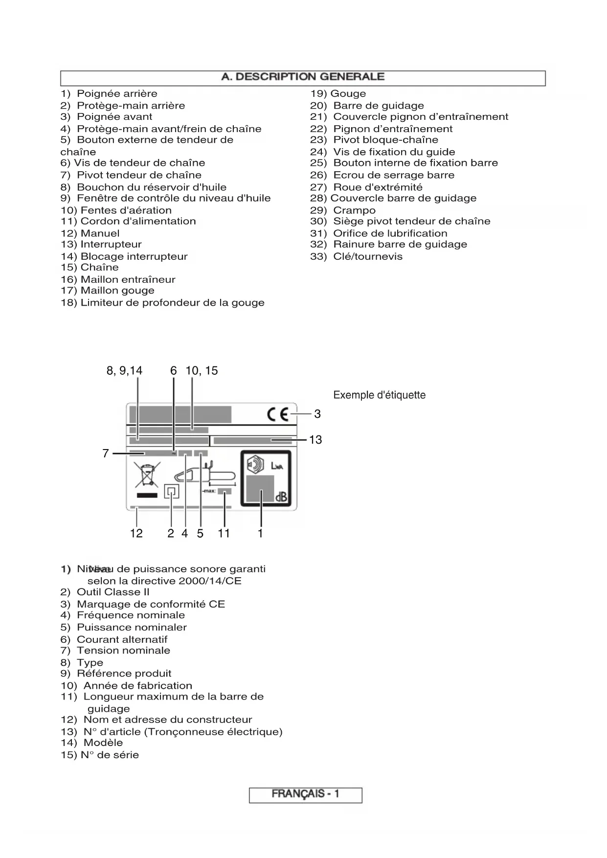 câble d’alimentation électrique n’est pas endommagé ou usé avant de l’enrouler pour le ranger. Ne pas réparer un câble endommagé. Porter le produit dans un Centre de service agrée pour faire remplacer le câble. 10.Enlever la prise du secteur avant de laisser le produit non utilisé pendant une certaine période. 11.Toujours enrouler le câble avec soin, en évitant de l’entortiller. 12.Utiliser uniquement la tension nominale d’alimentation secteur CA indiquée sur l’étiquette du produit. 13.La tronçonneuse est doublement isolée selon les normes EN60745-1 & EN60745-2-13. En aucun cas, aucune partie du produit ne doit être connectée à la terre. Câbles