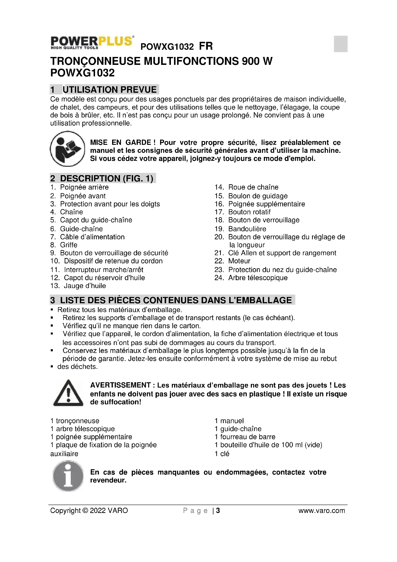 1 tronçonneuse 1 arbre télescopique 1 poignée supplémentaire 1 plaque de fixation de la poignée auxiliaire