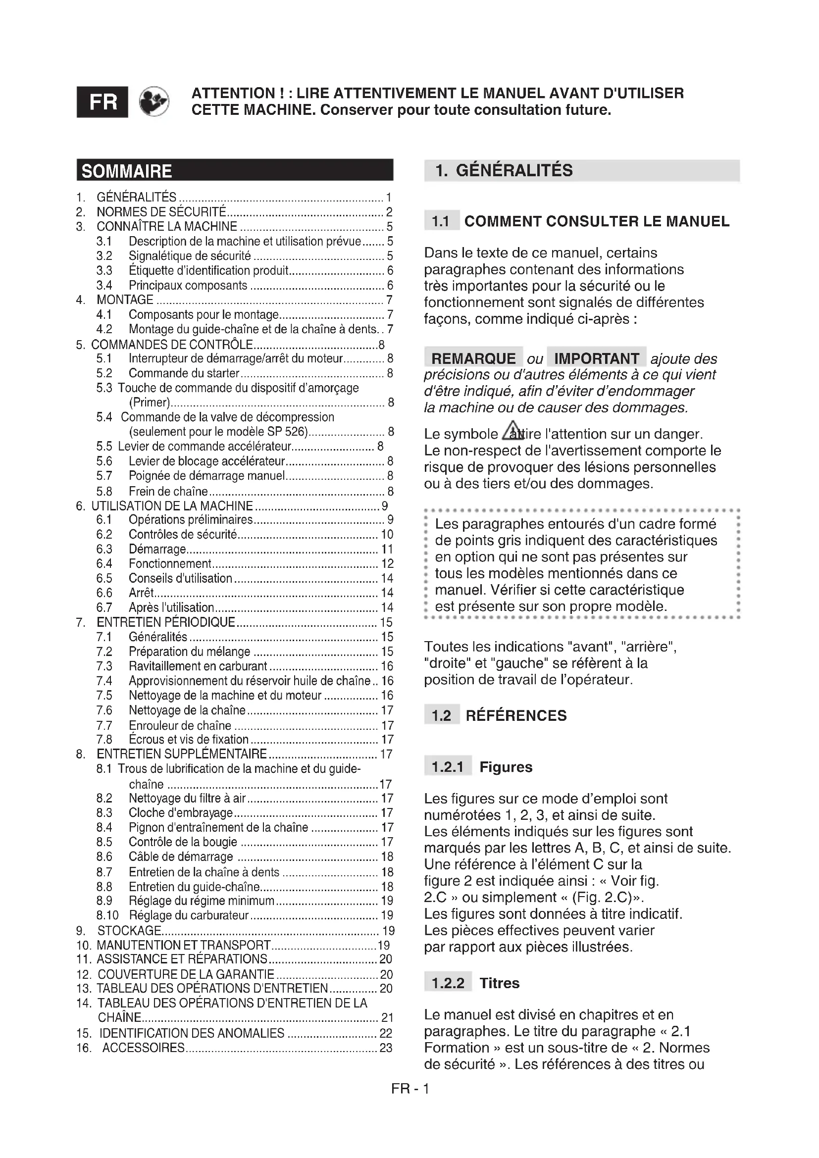 Le manuel est divisé en chapitres et en paragraphes. Le titre du paragraphe « 2.1 Formation » est un sous-titre de « 2. Normes de sécurité ». Les références à des titres ou ATTENTION ! : LIRE ATTENTIVEMENT LE MANUEL AVANT D'UTILISER CETTE MACHINE. Conserver pour toute consultation future.