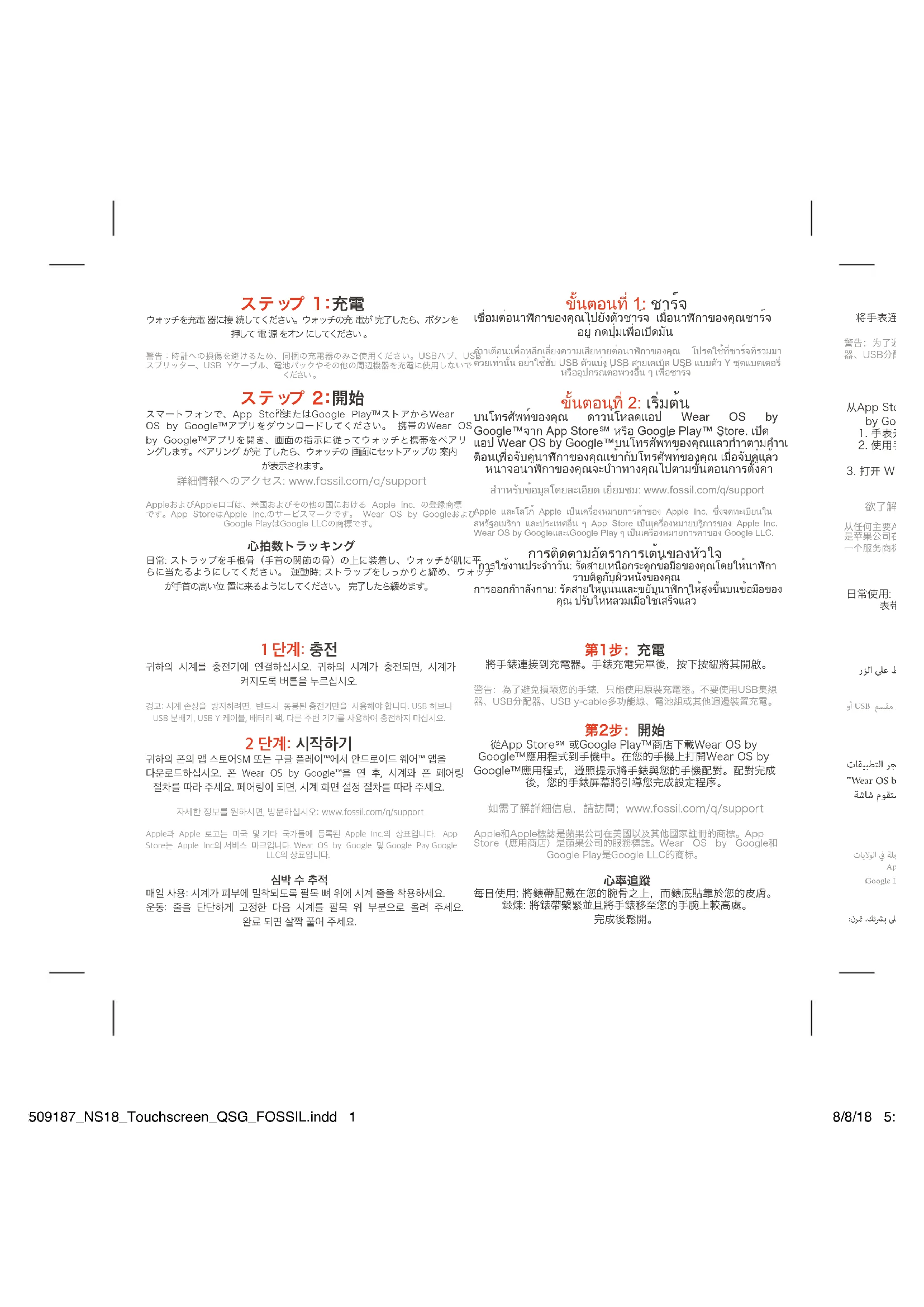 Sur votre téléphone, téléchargez l’application Wear OS by Google ™ dans l’App Store ℠ ou Google Play™. Ouvrez l’application Wear OS by Google™ sur votre téléphone et suivez les instructions pour synchroniser votre montre à votre téléphone. Une fois votre montre synchronisée, l’écran vous guidera à travers les procédures de configuration. Pour des informations détaillées, rendez-vous sur : www.fossil.com/q/support Pour plus d’informations sur l’utilisation de votre montre, visitez support. google.com/wearos Apple et le logo Apple sont des marques déposées par Apple Inc., enregistrées aux États-Unis et dans d’autres pays. App Store est une marque de service d’Apple Inc. Wear OS by Google et Google Play sont des marques déposées de Google LLC.