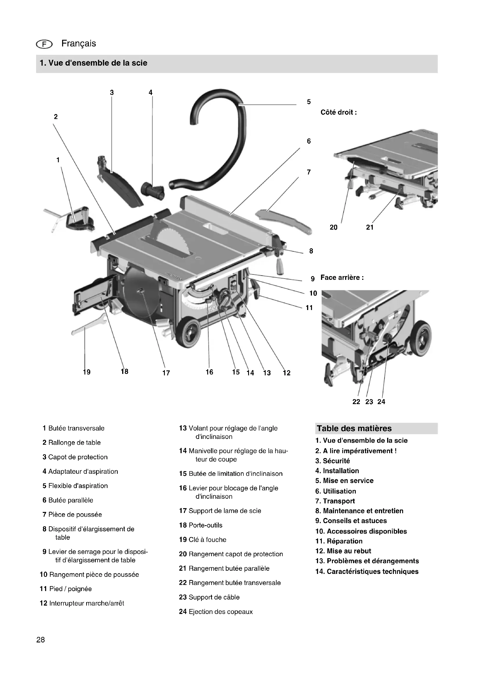 1 Butée transversale 2 Rallonge de table 3 Capot de protection 4 Adaptateur d'aspiration 5 Flexible d'aspiration 6 Butée parallèle 7 Pièce de poussée 8 Dispositif d'élargissement de table 9 Levier de serrage pour le disposi- tif d'élargissement de table 10 Rangement pièce de poussée 11 Pied / poignée 12 Interrupteur marche/arrêt 13 Volant pour réglage de l'angle d'inclinaison 14 Manivelle pour réglage de la hau- teur de coupe 15 Butée de limitation d'inclinaison 16 Levier pour blocage de l'angle d'inclinaison 17 Support de lame de scie 18 Porte-outils 19 Clé à fouche 20 Rangement capot de protection 21 Rangement butée parallèle 22 Rangement butée transversale 23 Support de câble 24 Ejection des copeaux Table des matières 17028992_10_TS254_FR.fm Originalbetriebsanleitung FRANÇAISFRANÇAIS