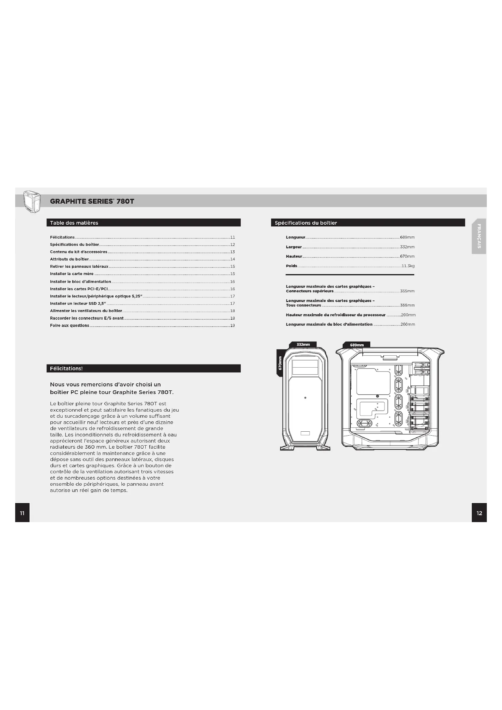 Spécifications du boîtier 670mm 332mm 689mm FRANÇAIS Table des matières Félicitations! Félicitations ................................................................................................................................................................. Spécifications du boîtier ........................................................................................................................................ Contenu du kit d’accessoires ............................................................................................................................... Attributs du boîtier................................................................................................................................................... Retirer les panneaux latéraux .............................................................................................................................. Installer la carte mère ............................................................................................................................................. Installer le bloc d'alimentation ........................................................................................................................... Installer les cartes PCI-E/PCI ............................................................................................................................... Installer le lecteur/périphérique optique 5,25" ........................................................................................... Installer un lecteur SSD 2,5" ................................................................................................................................ Alimenter les ventilateurs du boîtier ................................................................................................................ Raccorder les connecteurs E/S avant .............................................................................................................. Foire aux questions .................................................................................................................................................. Nous vous remercions d’avoir choisi un boîtier PC pleine tour Graphite Series 780T. Le boîtier pleine tour Graphite Series 780T est exceptionnel et peut satisfaire les fanatiques du jeu et du surcadençage grâce à un volume susant pour accueillir neuf lecteurs et près d'une dizaine de ventilateurs de refroidissement de grande taille. Les inconditionnels du refroidissement à eau apprécieront l'espace généreux autorisant deux radiateurs de 360 mm. Le boîtier 780T facilite considérablement la maintenance grâce à une dépose sans outil des panneaux latéraux, disques durs et cartes graphiques. Grâce à un bouton de contrôle de la ventilation autorisant trois vitesses et de nombreuses options destinées à votre ensemble de périphériques, le panneau avant autorise un réel gain de temps. Longueur ..................................................................................................mm Largeur .....................................................................................................mm Hauteur .....................................................................................................mm Poids ............................................................................................................kg Longueurmaximaledescartesgraphiques– Connecteurssupérieurs ....................................................................mm Longueurmaximaledescartesgraphiques– Tousconnecteurs .................................................................................mm Hauteurmaximaledurefroidisseurduprocesseur ...............mm Longueurmaximaledublocd’alimentation ............................mmGRAPHITE SERIES