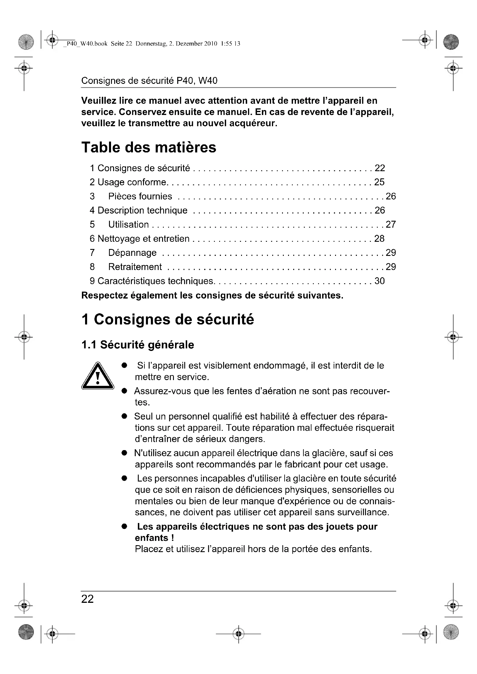 - Veuillez lire ce manuel avec attention avant de mettre l’appareil en service. Conservez ensuite ce manuel. En cas de revente de l’appareil, veuillez le transmettre au nouvel acquéreur. Table des matières 1 Consignes de sécurité p. 22