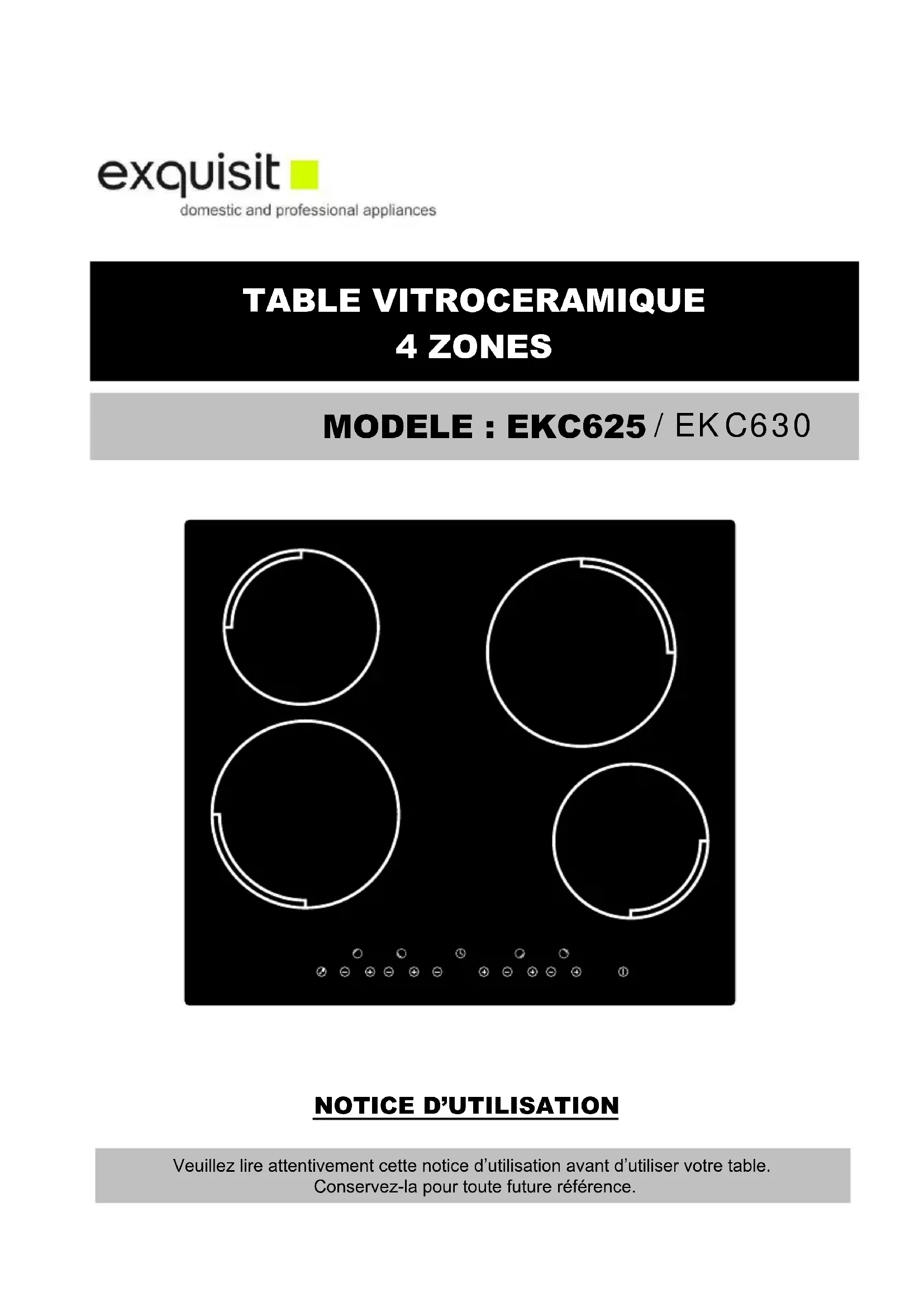 TABLE VITROCERAMIQUE 4 ZONES Veuillez lire attentivement cette notice d’utilisation avant d’utiliser votre table. Conservez-la pour toute future référence. MODELE : EKC625 / EKC630Cette notice comporte des chapitres relatifs aux consignes de sécurité, aux consignes d’utilisation, aux consignes d’installation et aux conseils de dépannage. Une lecture attentive de cette notice avant d’utiliser cette table de cuisson vous aidera à utiliser et à entretenir le produit correctement. AVANT DE CONTACTER VOTRE SERVICE APRES VENTE Le chapitre concernant les conseils de dépannage vous aidera à résoudre vous-même certains problèmes courants sans avoir besoin de recourir au service de techniciens professionnels. NOTE : Le fabricant, conformément à une politique de développement permanent de mise à jour du produit, peut effectuer toute modification nécessaire sans donner de notification préalable.
