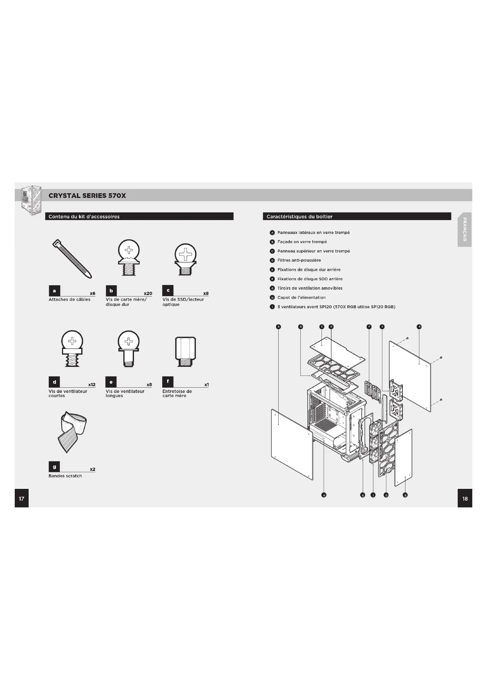FRANÇAIS Caractéristiques du boîtier Contenu du kit d’accessoires Panneaux latéraux en verre trempé Façade en verre trempé Panneau supérieur en verre trempé Filtres anti-poussière Fixations de disque dur arrière Fixations de disque SDD arrière Tiroirs de ventilation amovibles Capot de l’alimentation 3 ventilateurs avant SP120 (570X RGB utilise SP120 RGB)