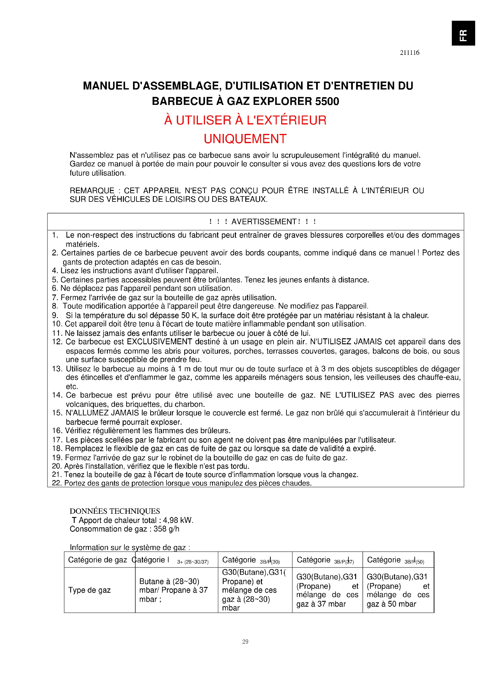 12. Ce barbecue est EXCLUSIVEMENT destiné à un usage en plein air. N'UTILISEZ JAMAIS cet appareil dans des