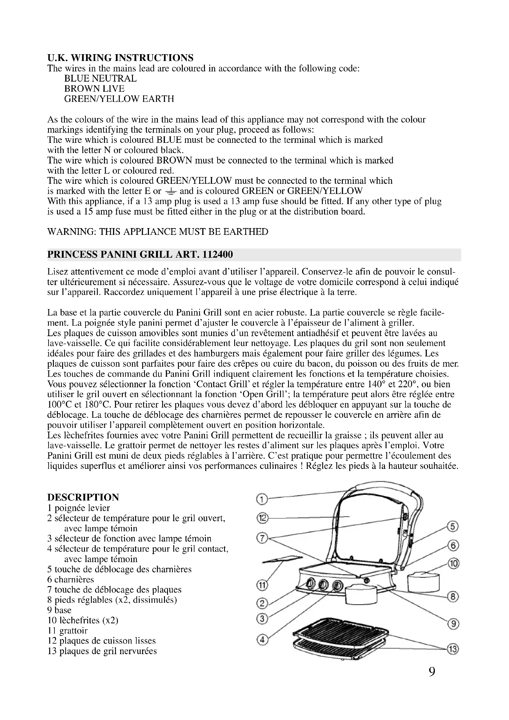 Lisez attentivement ce mode d’emploi avant d’utiliser l’appareil. Conservez-le afin de pouvoir le consul- ter ultérieurement si nécessaire. Assurez-vous que le voltage de votre domicile correspond à celui indiqué sur l’appareil. Raccordez uniquement l’appareil à une prise électrique à la terre. La base et la partie couvercle du Panini Grill sont en acier robuste. La partie couvercle se règle facile- ment. La poignée style panini permet d’ajuster le couvercle à l’épaisseur de l’aliment à griller. Les plaques de cuisson amovibles sont munies d’un revêtement antiadhésif et peuvent être lavées au lave-vaisselle. Ce qui facilite considérablement leur nettoyage. Les plaques du gril sont non seulement idéales pour faire des grillades et des hamburgers mais également pour faire griller des légumes. Les plaques de cuisson sont parfaites pour faire des crêpes ou cuire du bacon, du poisson ou des fruits de mer. Les touches de commande du Panini Grill indiquent clairement les fonctions et la température choisies. Vous pouvez sélectionner la fonction ‘Contact Grill’ et régler la température entre 140° et 220°, ou bien utiliser le gril ouvert en sélectionnant la fonction ‘Open Grill’; la température peut alors être réglée entre 100°C et 180°C. Pour retirer les plaques vous devez d’abord les débloquer en appuyant sur la touche de déblocage. La touche de déblocage des charnières permet de repousser le couvercle en arrière afin de pouvoir utiliser l’appareil complètement ouvert en position horizontale. Les lèchefrites fournies avec votre Panini Grill permettent de recueillir la graisse ; ils peuvent aller au lave-vaisselle. Le grattoir permet de nettoyer les restes d’aliment sur les plaques après l’emploi. Votre Panini Grill est muni de deux pieds réglables à l’arrière. C’est pratique pour permettre l’écoulement des liquides superflus et améliorer ainsi vos performances culinaires ! Réglez les pieds à la hauteur souhaitée. DESCRIPTION 1 poignée levier 2 sélecteur de température pour le gril ouvert, avec lampe témoin 3 sélecteur de fonction avec lampe témoin 4 sélecteur de température pour le gril contact, avec lampe témoin 5 touche de déblocage des charnières 6 charnières 7 touche de déblocage des plaques 8 pieds réglables (x2, dissimulés) 9 base 10 lèchefrites (x2) 11 grattoir 12 plaques de cuisson lisses 13 plaques de gril nervurées