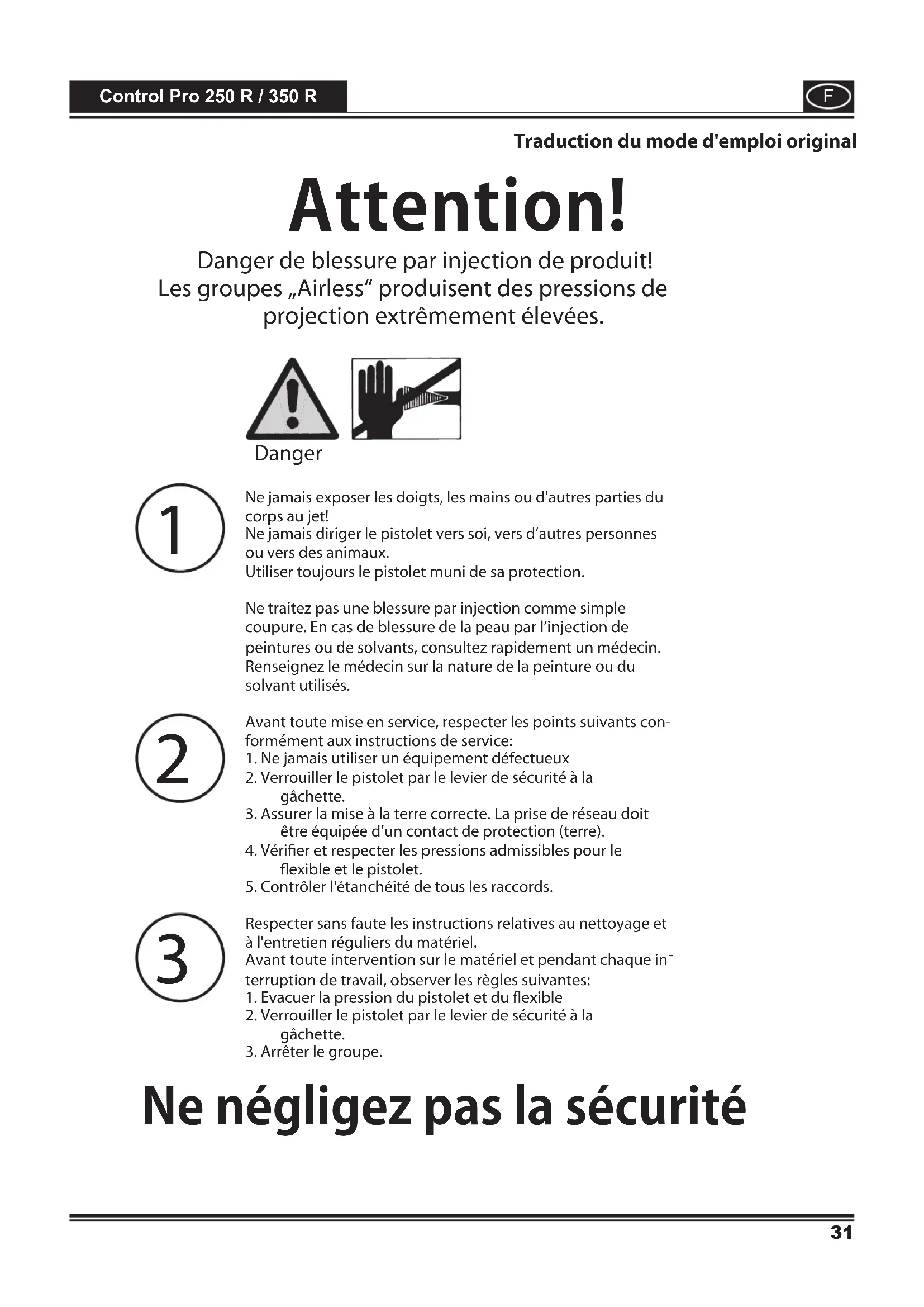 Danger de blessure par injection de produit! Les groupes „Airless“ produisent des pressions de projection extrêmement élevées.
