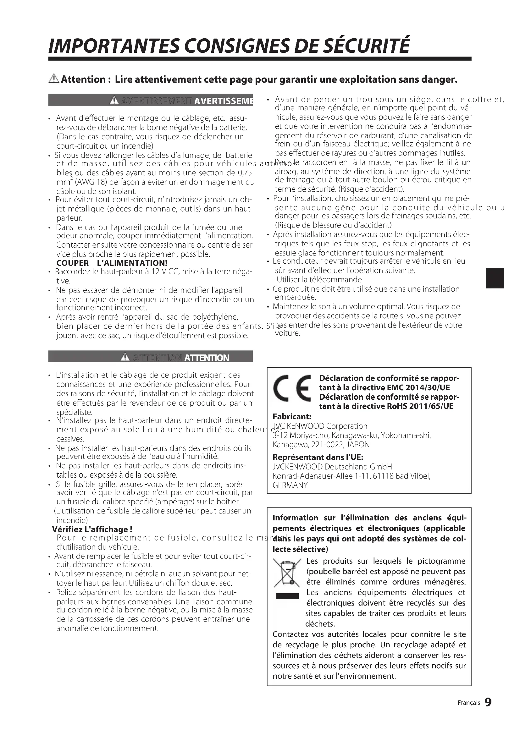 - Maintenez le son à un volume optimal. Vous risquez de provoquer des accidents de la route si vous ne pouvez pas entendre les sons provenant de l’extérieur de votre voiture. Déclaration de conformité se rappor- tant à la directive EMC 2014/30/UE Déclaration de conformité se rappor- tant à la directive RoHS 2011/65/UE Fabricant: JVC KENWOOD Corporation 3-12 Moriya-cho, Kanagawa-ku, Yokohama-shi, Kanagawa, 221-0022, JAPON Représentant dans l’UE: JVCKENWOOD Deutschland GmbH Konrad-Adenauer-Allee 1-11, 61118 Bad Vilbel, GERMANY 2FRJ.indd92FRJ.indd9 2017/12/2818:512017/12/2818:5110 Français Pièces Attention: Avant d’effectuer le câblage, détachez le câble de la borne négative de la batterie. Lorsque le câblage est terminé, vérifiez si les câbles sont tous bien raccordés. À ce moment seulement, rebranchez le câble sur la borne négative de la batterie. Bornes du caisson d’extrême grave Raccordement de la télécommande Remarques: