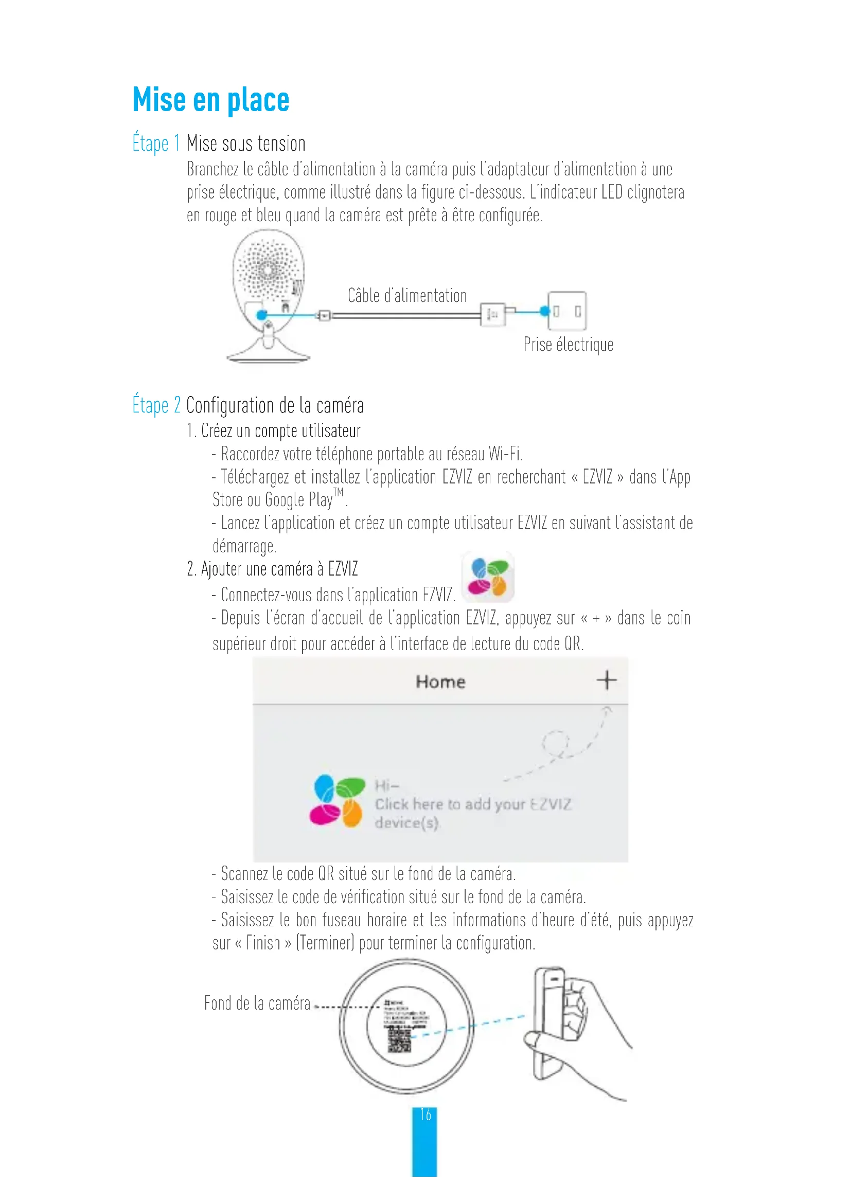 - Connectez-vous dans l’application EZVIZ. - Depuis l’écran d’accueil de l’application EZVIZ, appuyez sur «+» dans le coin supérieur droit pour accéder à l’interface de lecture du code QR. - Scannez le code QR situé sur le fond de la caméra. - Saisissez le code de vérification situé sur le fond de la caméra. - Saisissez le bon fuseau horaire et les informations d’heure d’été, puis appuyez sur «Finish» (Terminer) pour terminer la configuration. Fond de la caméra17