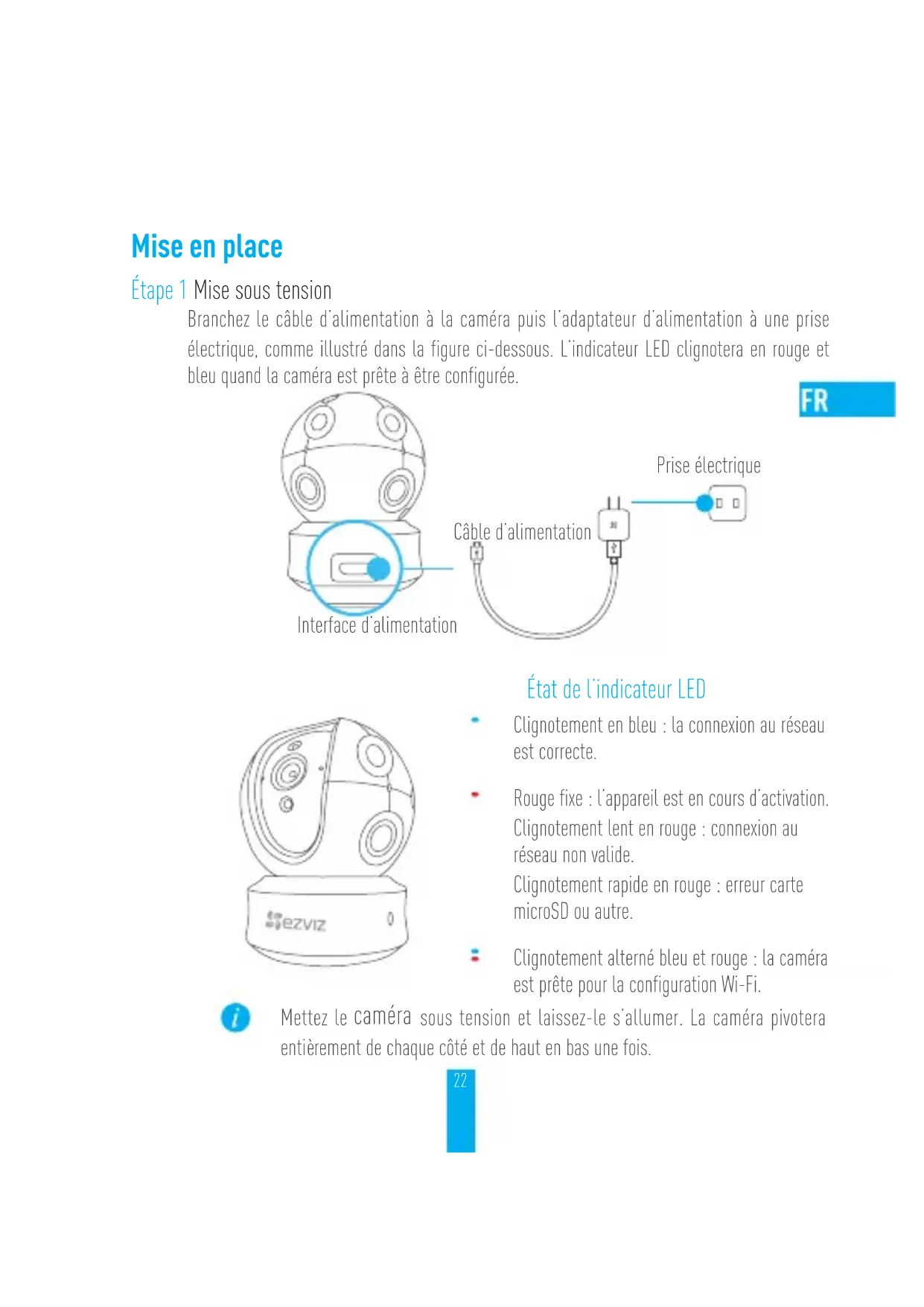 la red Wi-Fi, se conectará automáticamente a la misma red Wi-Fi.20 Anexo Contenido de la caja Cámara (x1) Base (x1) Cable de alimentación (x1) Plantilla de perforación (x1) Juego de tornillos (x1) Adaptador de corriente (x1) Guía de inicio rápido (x1)21 Tipo A Tipo B Tipo Indicador LED El altavoz Interfaz de alimentación Indicador LED El altavoz Interfaz de alimentación Interfaz de LAN22 Mise en place Étape 1 Mise sous tension Branchez le câble d’alimentation à la caméra puis l’adaptateur d’alimentation à une prise électrique, comme illustré dans la figure ci-dessous. L’indicateur LED clignotera en rouge et bleu quand la caméra est prête à être configurée. Interface d’alimentation Câble d’alimentation Prise électrique État de l’indicateur LED Clignotement en bleu: la connexion au réseau est correcte. Rouge fixe: l’appareil est en cours d’activation. Clignotement lent en rouge: connexion au réseau non valide. Clignotement rapide en rouge: erreur carte microSD ou autre. Clignotement alterné bleu et rouge: la caméra est prête pour la configuration Wi-Fi. Mettez le caméra sous tension et laissez-le s’allumer. La caméra pivotera entièrement de chaque côté et de haut en bas une fois.23 Étape 2 Configuration de la caméra