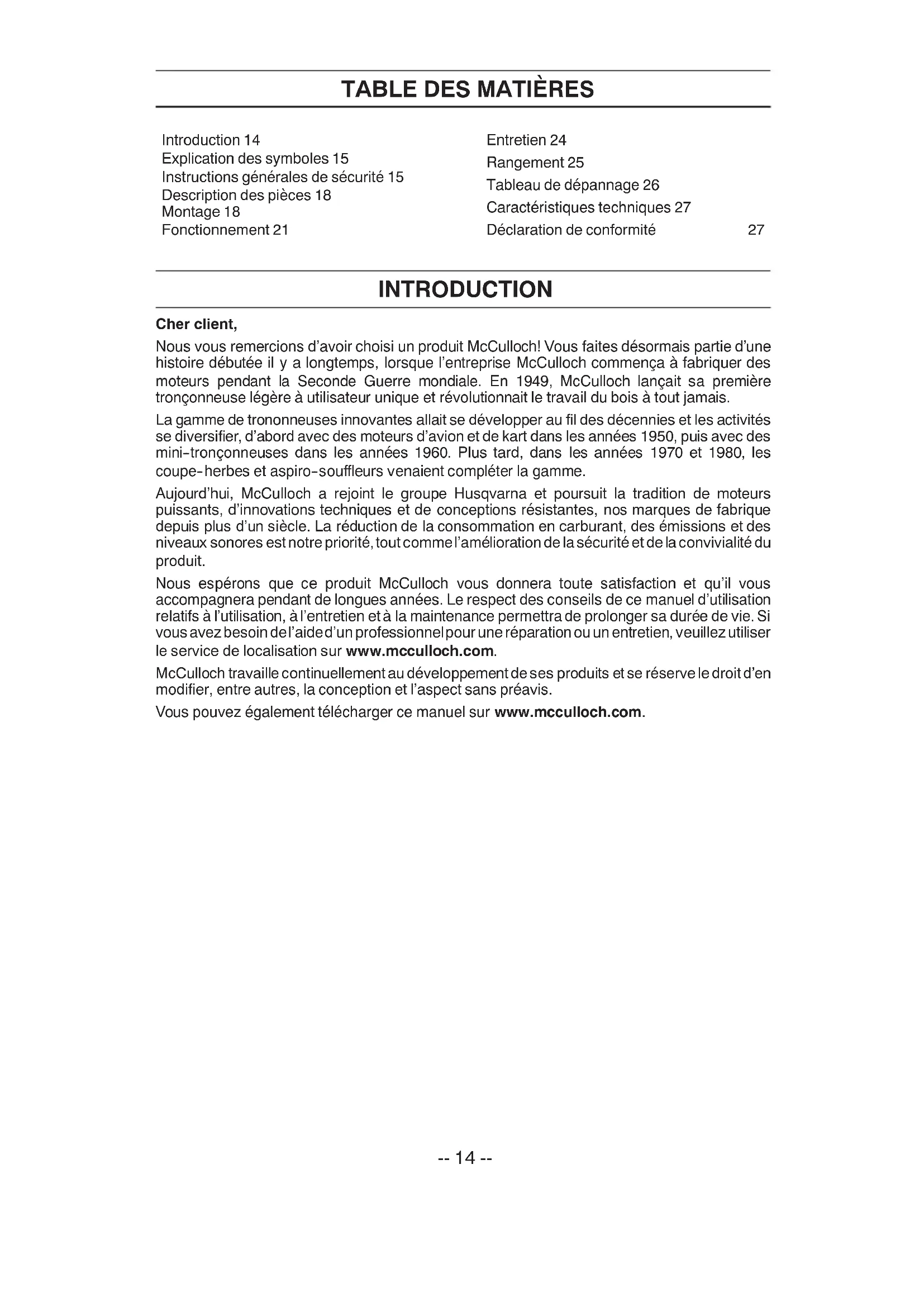 Nous espérons que ce produit McCulloch vous donnera toute satisfaction et qu'il vous accompagnera pendant de longues années. Le respect des conseils de ce manuel d'utilisation relatifs à l'utilisation, à l'entretien et à la maintenance permettra de prolonger sa durée de vie. Si vous avez besoin del'aide d'un professionnel pour une réparation ou un entretien, veuillez utiliser le service de localisation sur www.mcculloch.com.